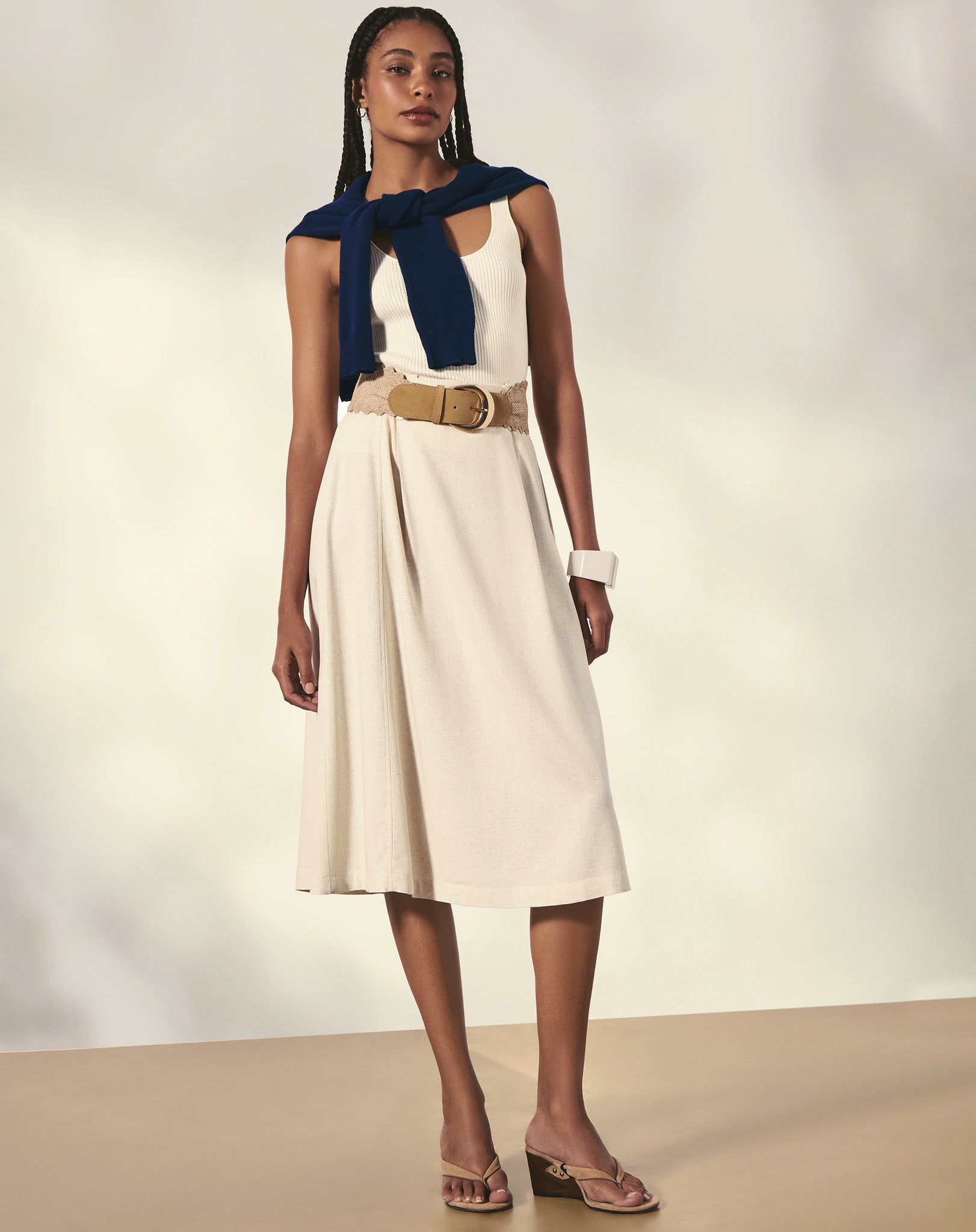 Tecidos fluidos, frescos e com bom caimento são protagonistas do verão 2026. Vestidos soltos, saias amplas, camisas de algodão e linho garantem conforto térmico e movimento, além de serem fáceis de combinar em diferentes ocasiões do dia.