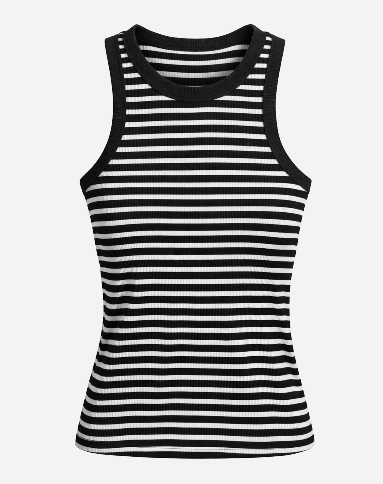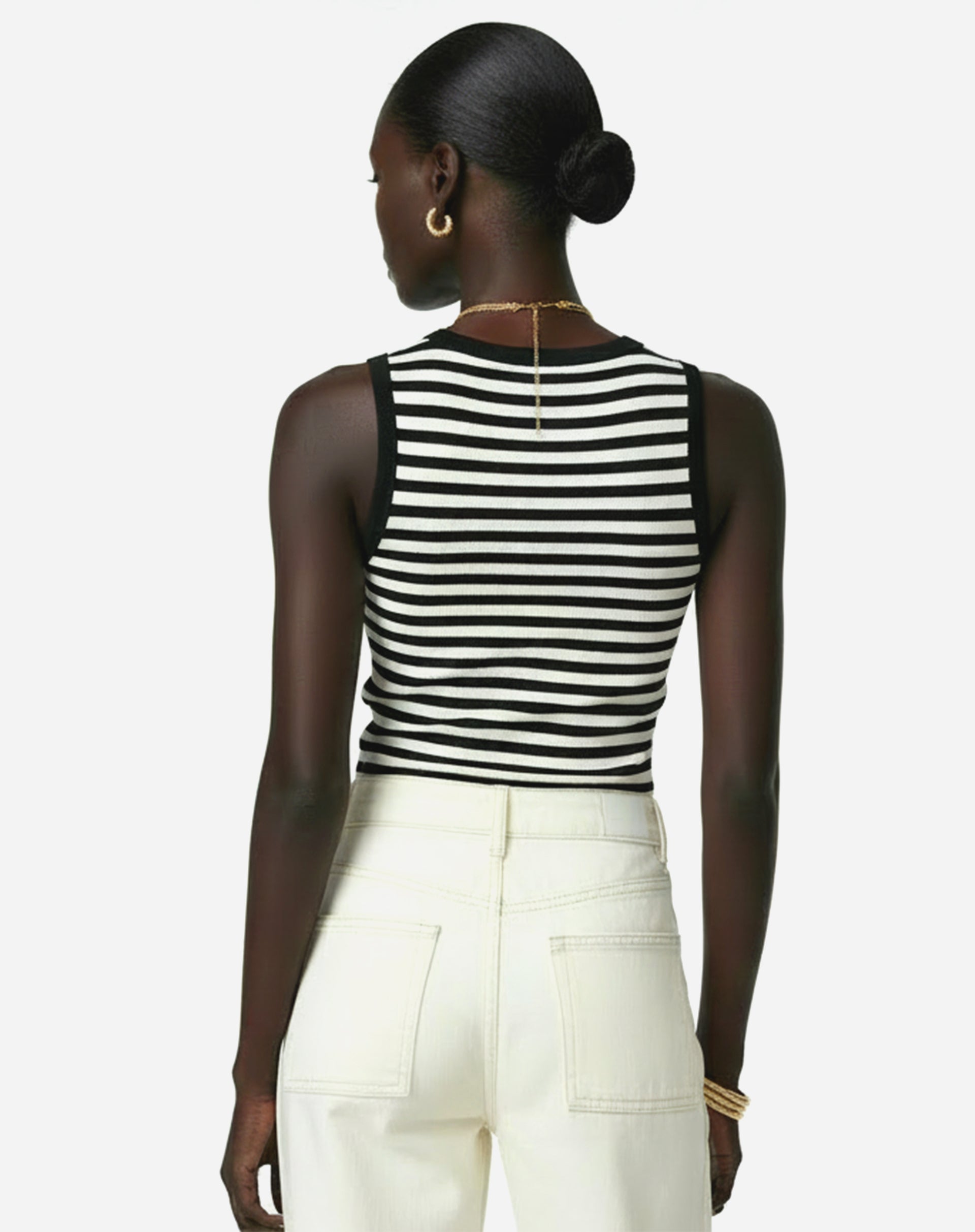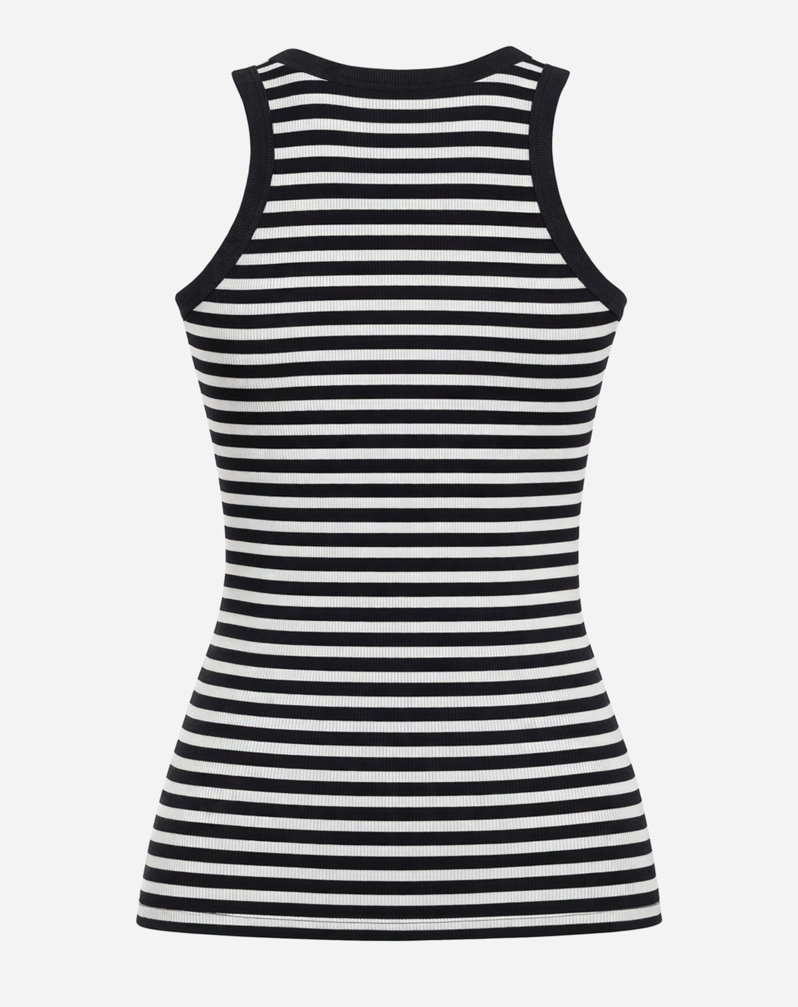 Regata Halter em malha ribana listrada, com caimento ajustado e visual moderno. Ideal para composições leves e contemporâneas.