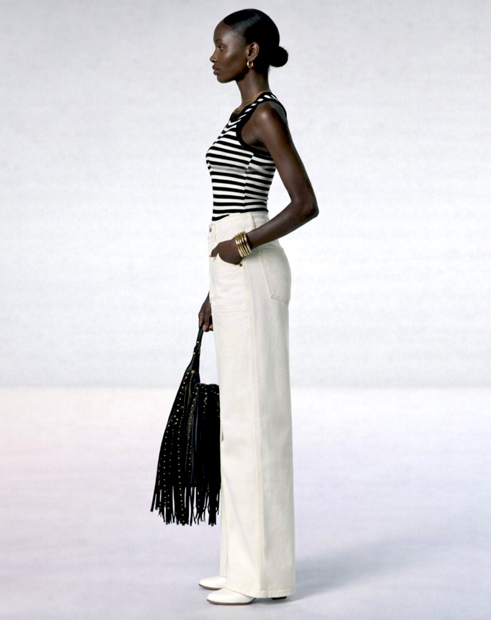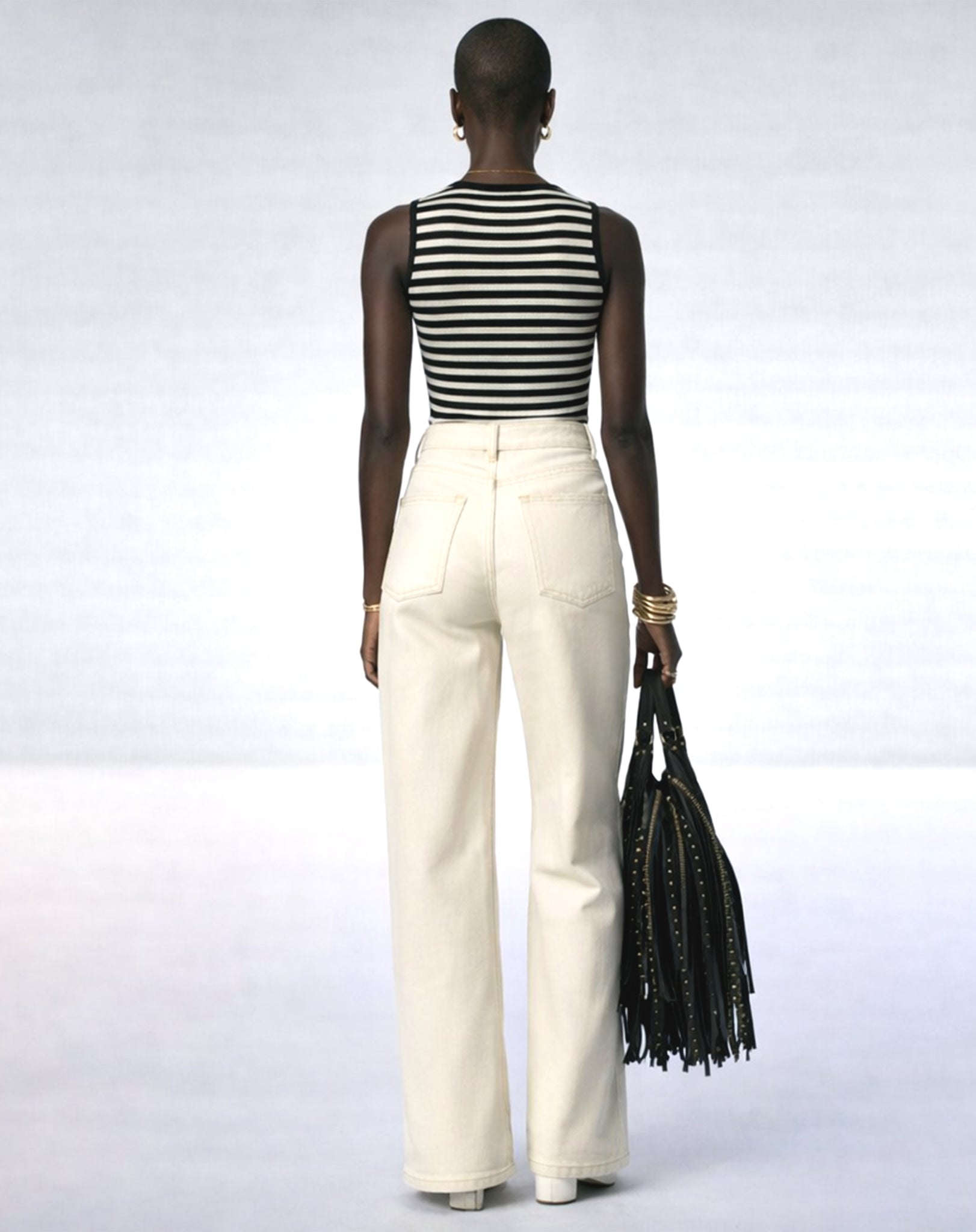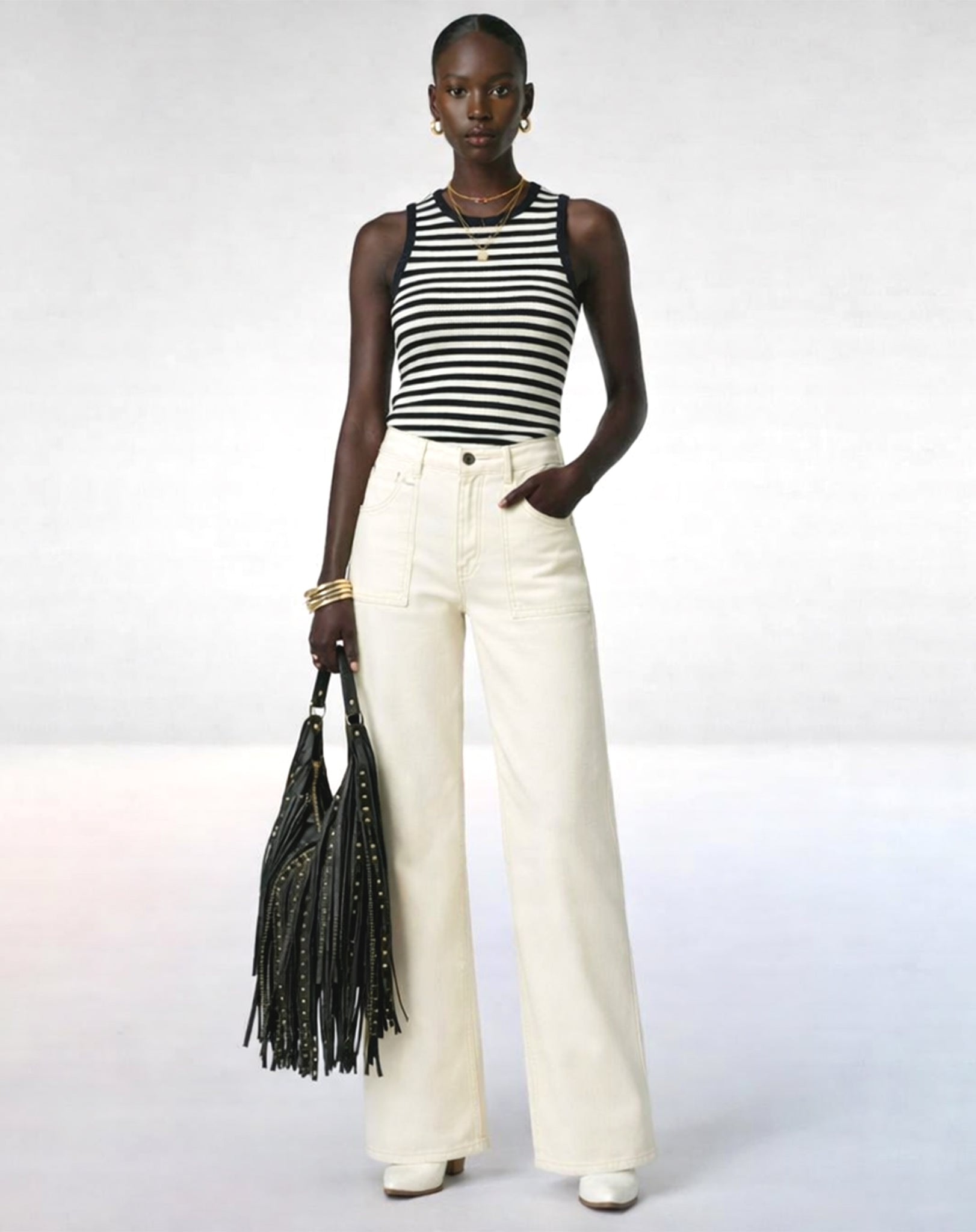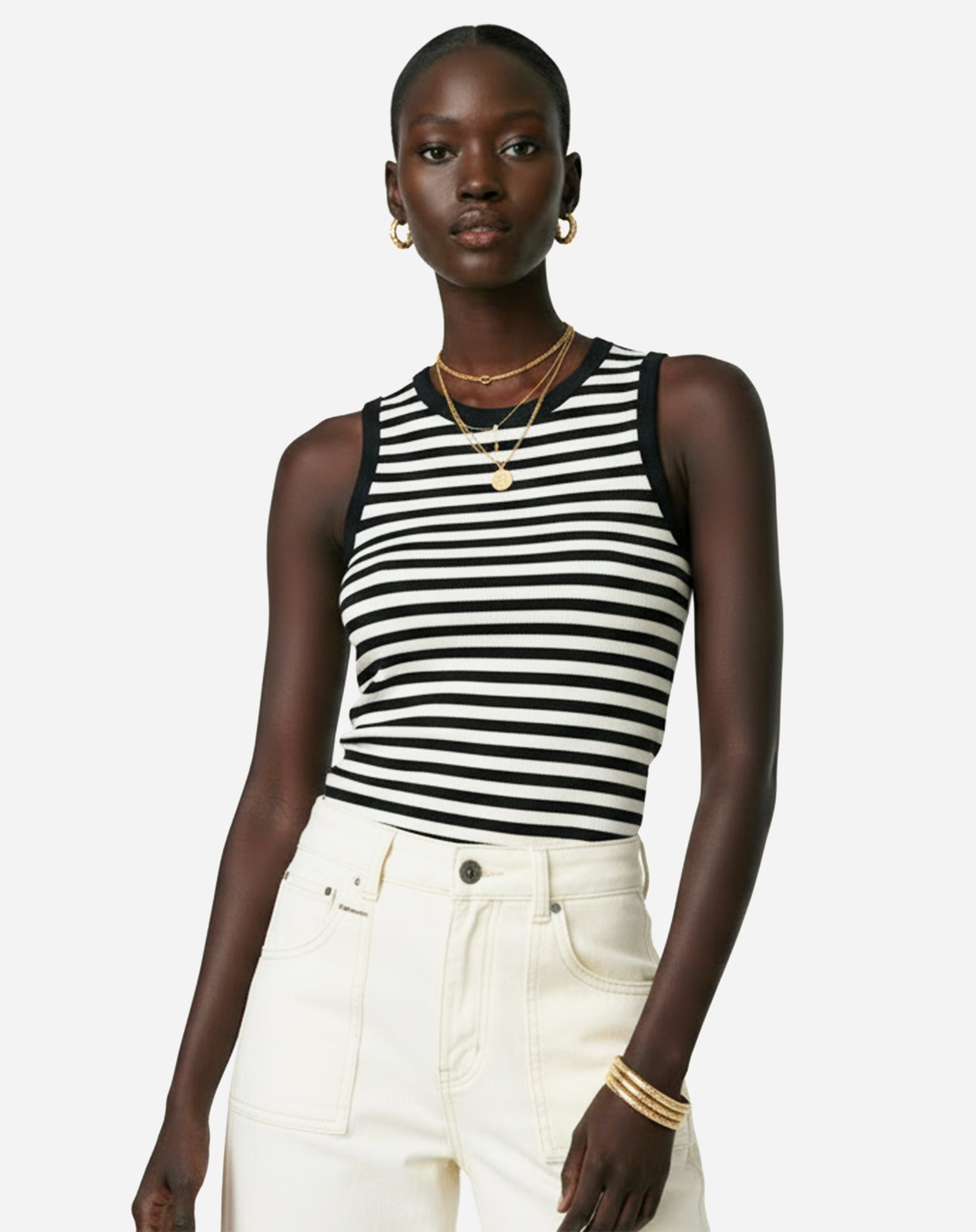 Regata Halter em malha ribana listrada, com caimento ajustado e visual moderno. Ideal para composições leves e contemporâneas.