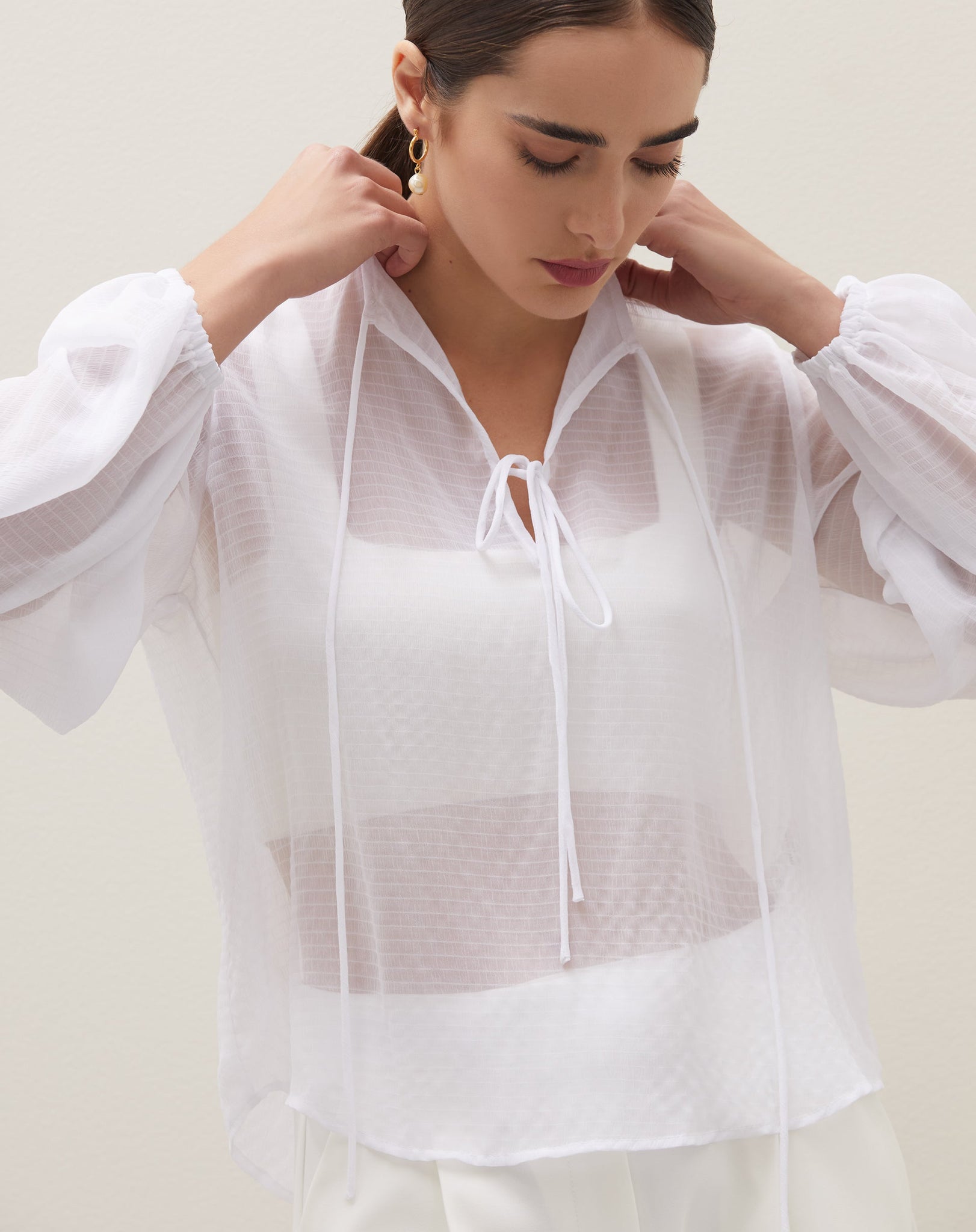 Destaque seu estilo com Camisa com amarração no decote, perfeita para um look casual chic. A manga bufante e a gola laço trazem um toque de elegância e sofisticação ao visual.