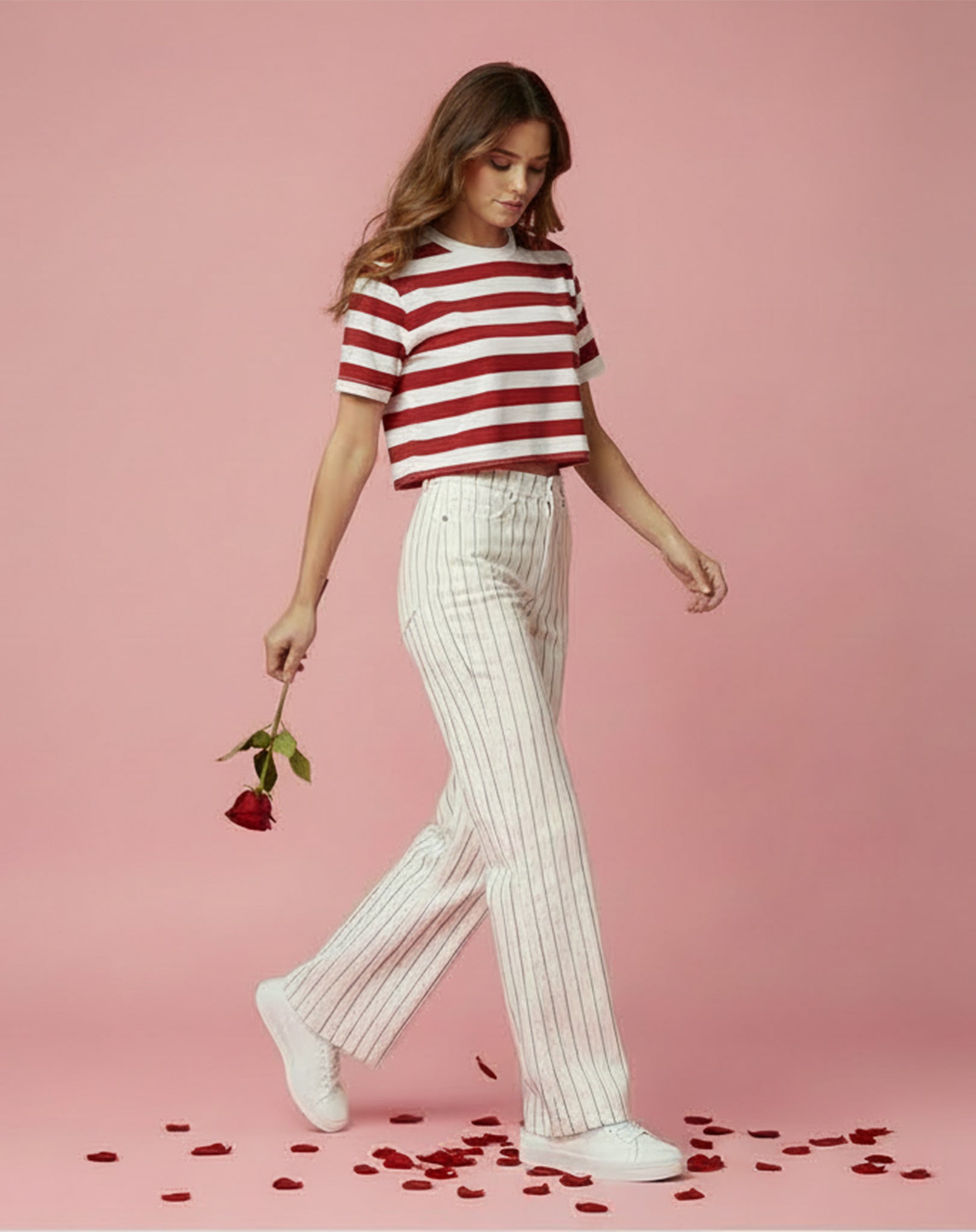 Modelo vestindo camiseta cropped de tricot listrada em vermelho e branco com calça jeans.