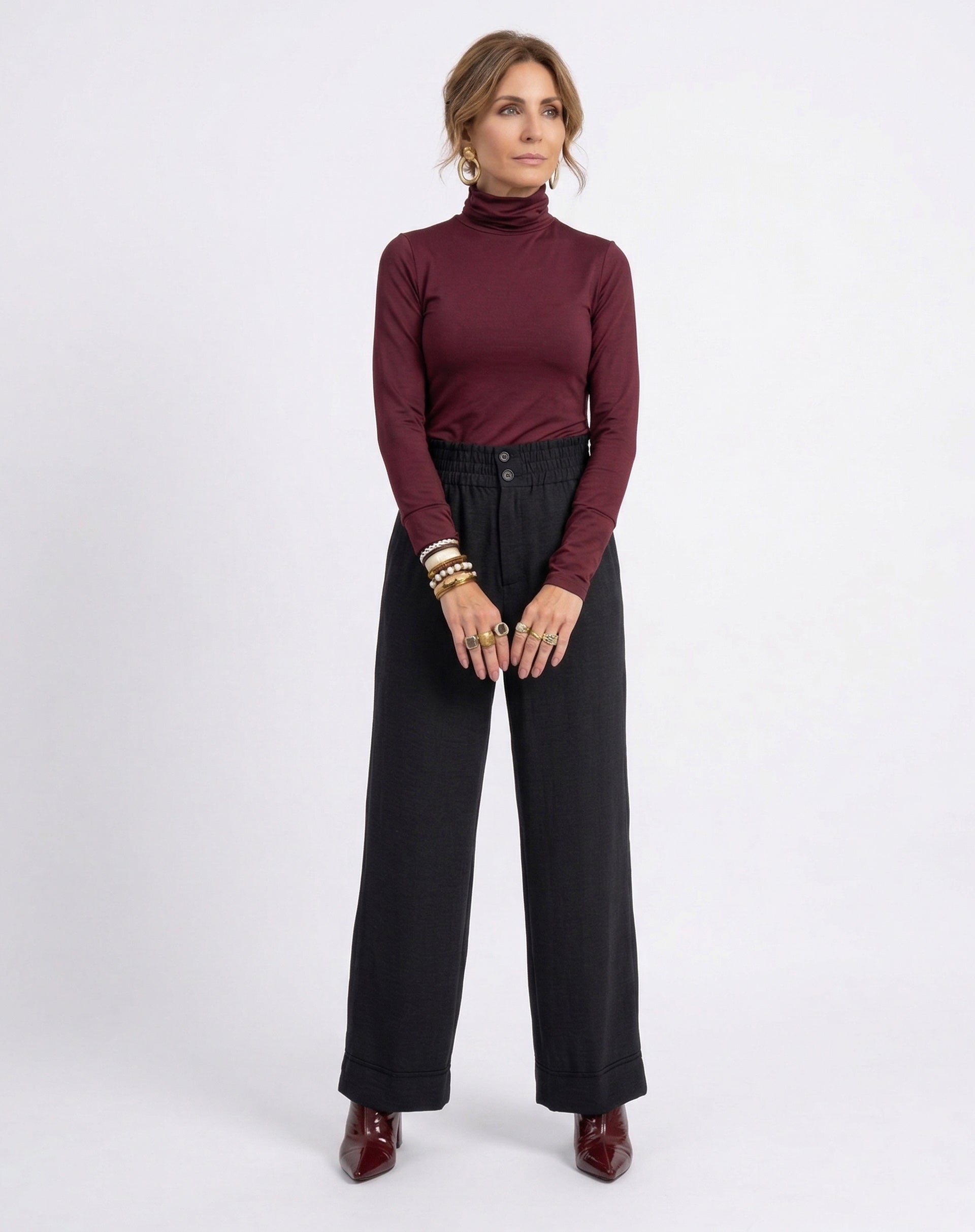 Explore a elegância e o conforto da Calça Pantalona com Cós de Elástico. Sua modelagem ampla proporciona movimento e sofisticação, enquanto o cós com elástico garante ajuste prático e confortável ao corpo. Versátil, é perfeita para compor produções que vão do dia a dia a ocasiões mais elegantes, com leveza e estilo.