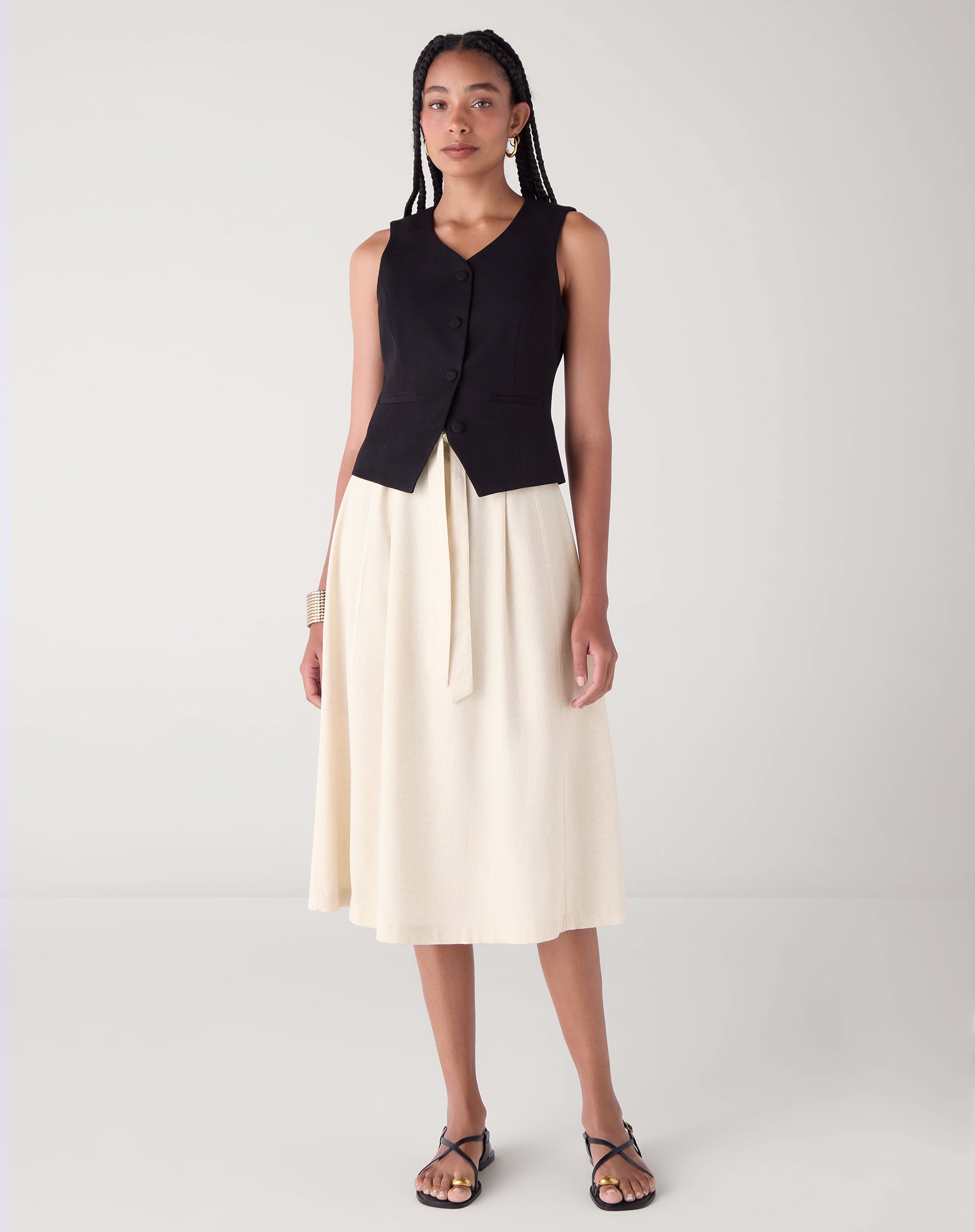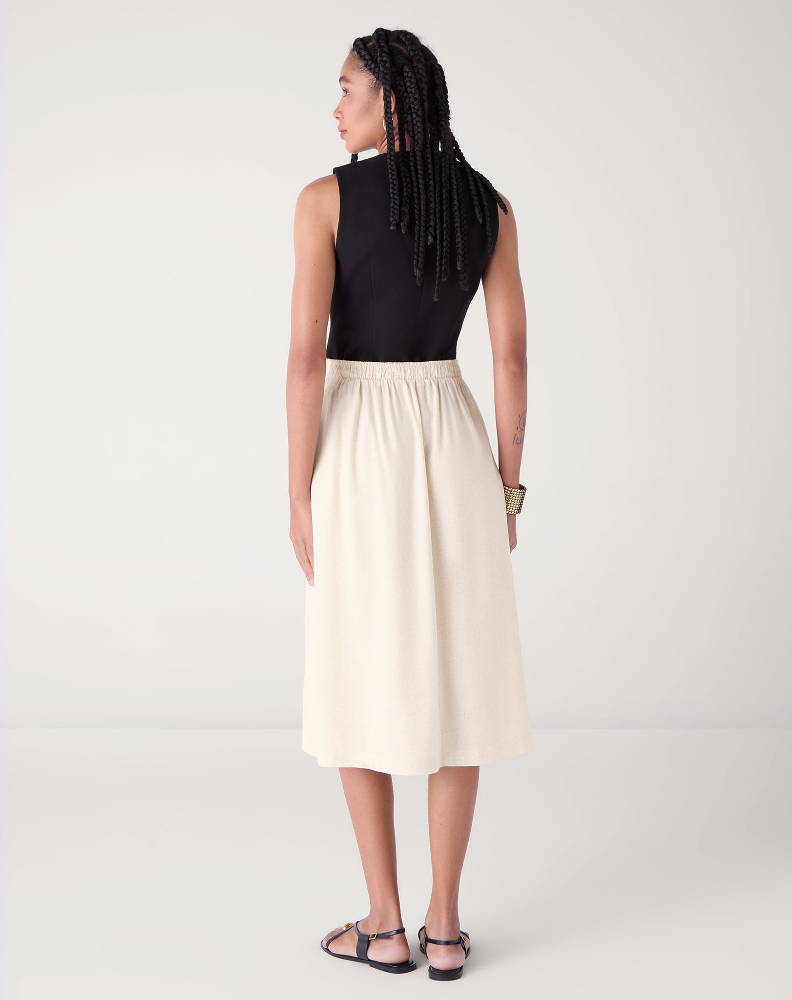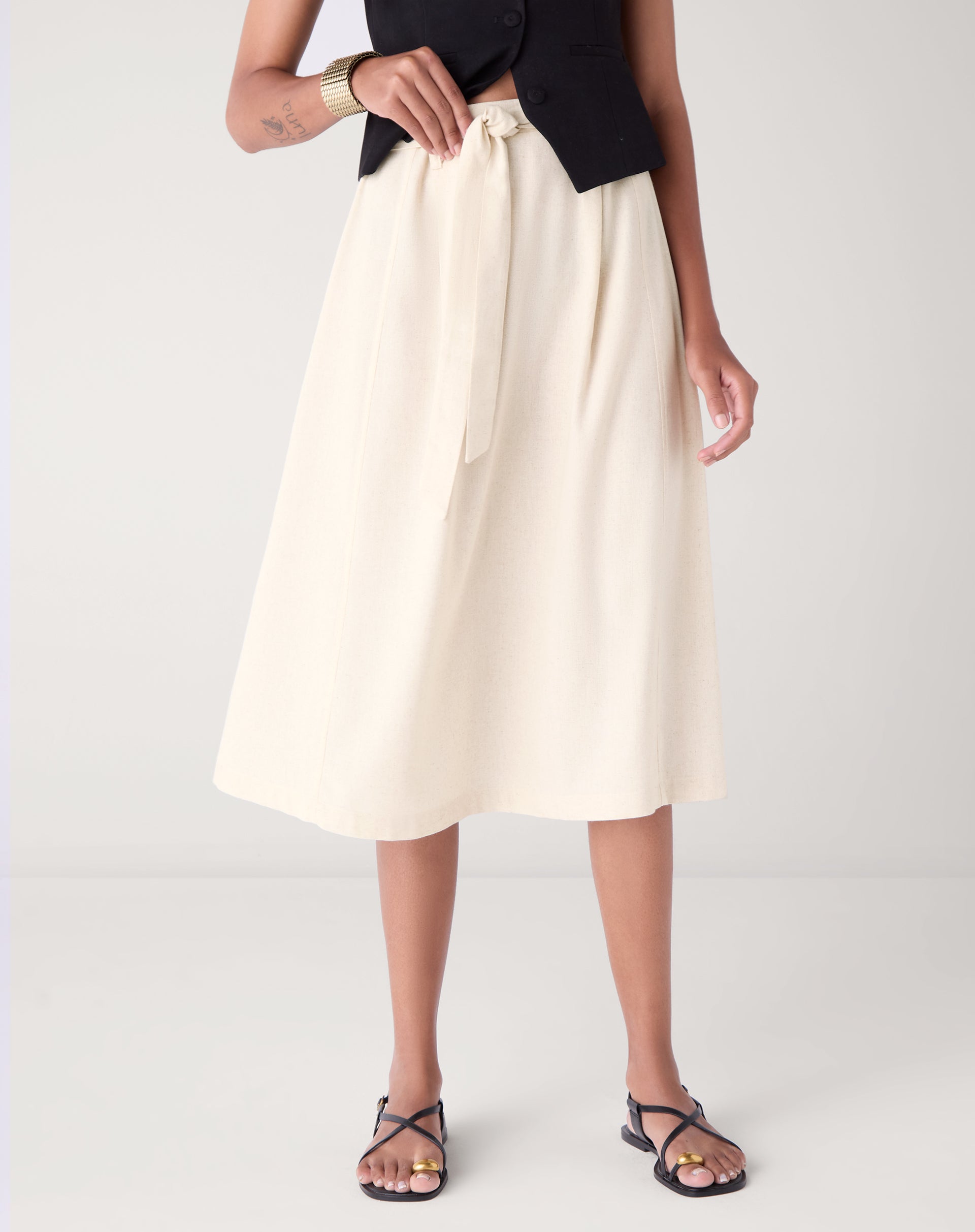 A Saia com Amarração é a peça perfeita para mulheres sofisticadas e modernas. Seu design evasê e cós alto garantem um look elegante e atual. Feita em linho e viscose, proporciona conforto fresh e estilo em qualquer ocasião. Ideal para o alto verão e festividades.
