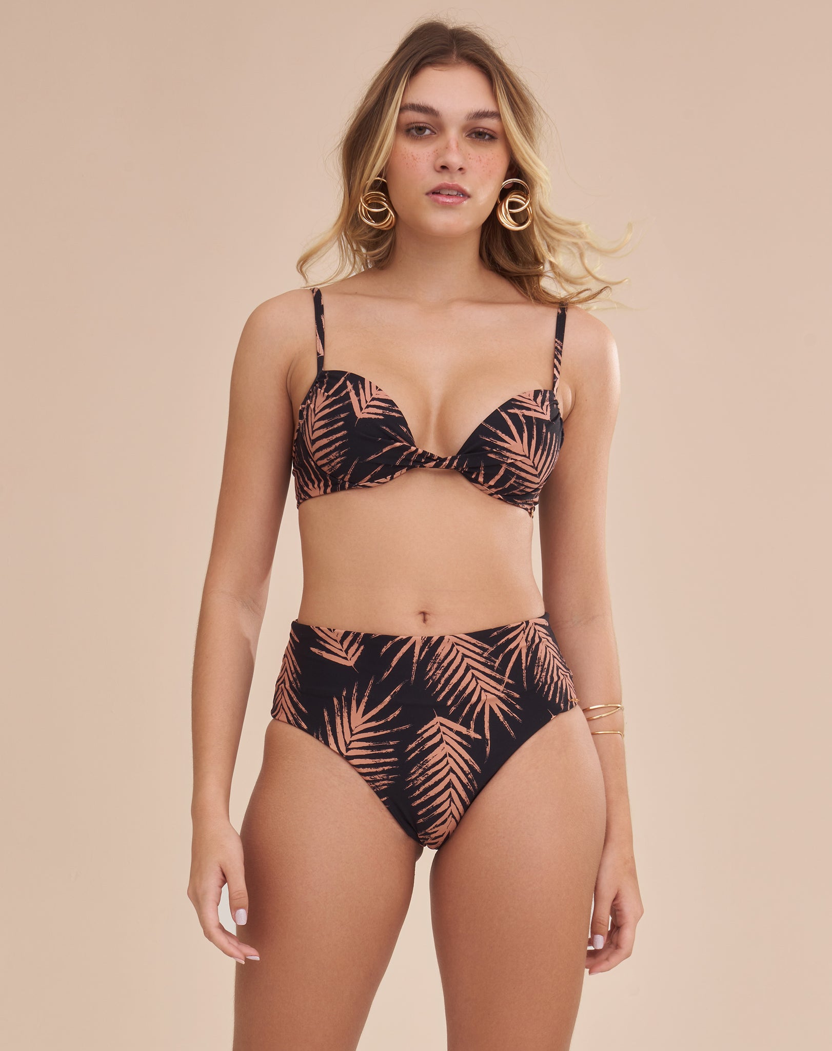 Top com bojo, aro, e alças com regulagens. O fecho traseiro é de metal revestido banho dourado. A coleção Palms tem estampa exclusiva inspirada nas lindas palmeiras que beiram o mar. Toda em tecido biodegradável, essa peça proporciona uma silhueta linda no corpo, e é indicada para quem tem seios pequenos a médios. São duas variantes de cor, em opções neutras. Uma fundo nude no tom areia com palmeiras em tons camelo e outra fundo preto também com palmeiras em tons camelos. Dificil escolher qual combinação mais bonita. A coleção ainda é completa com roupas na mesma estampa para combinar.