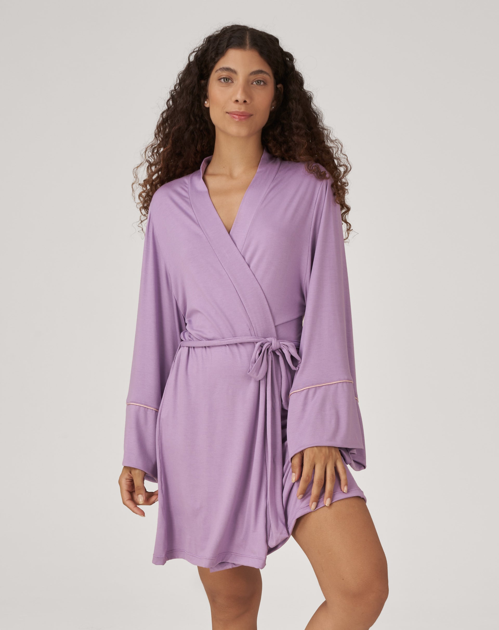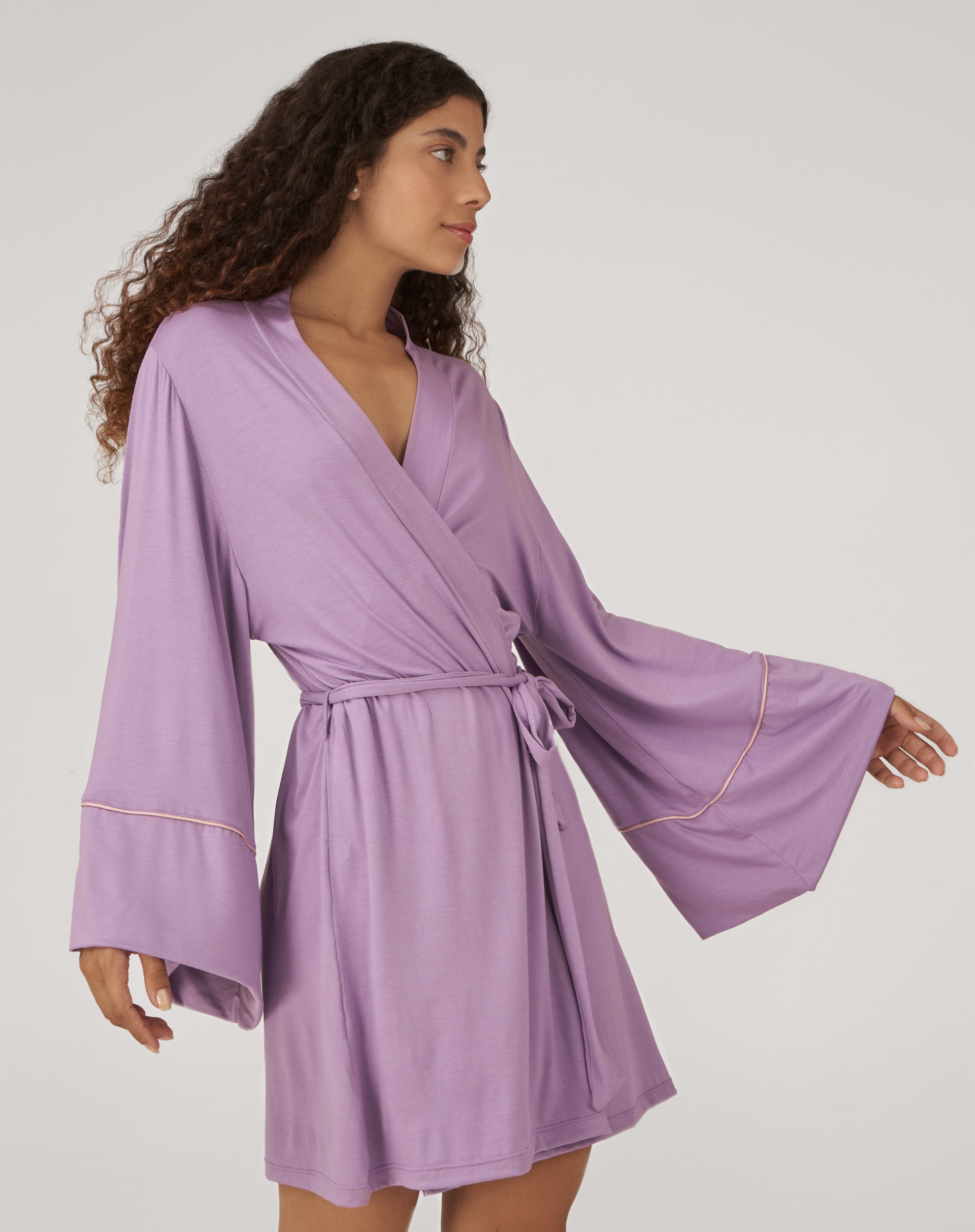 Robe todo em viscolycra básico. Ideal para usar dia-dia. Super confortável, as mangas na medida certa para fazer quaisquer movimentos. O tom lilás é delicado e encantador. Transmite leveza e suavidade, trazendo um ar romântico e moderno que valoriza todos os tons de pele.
