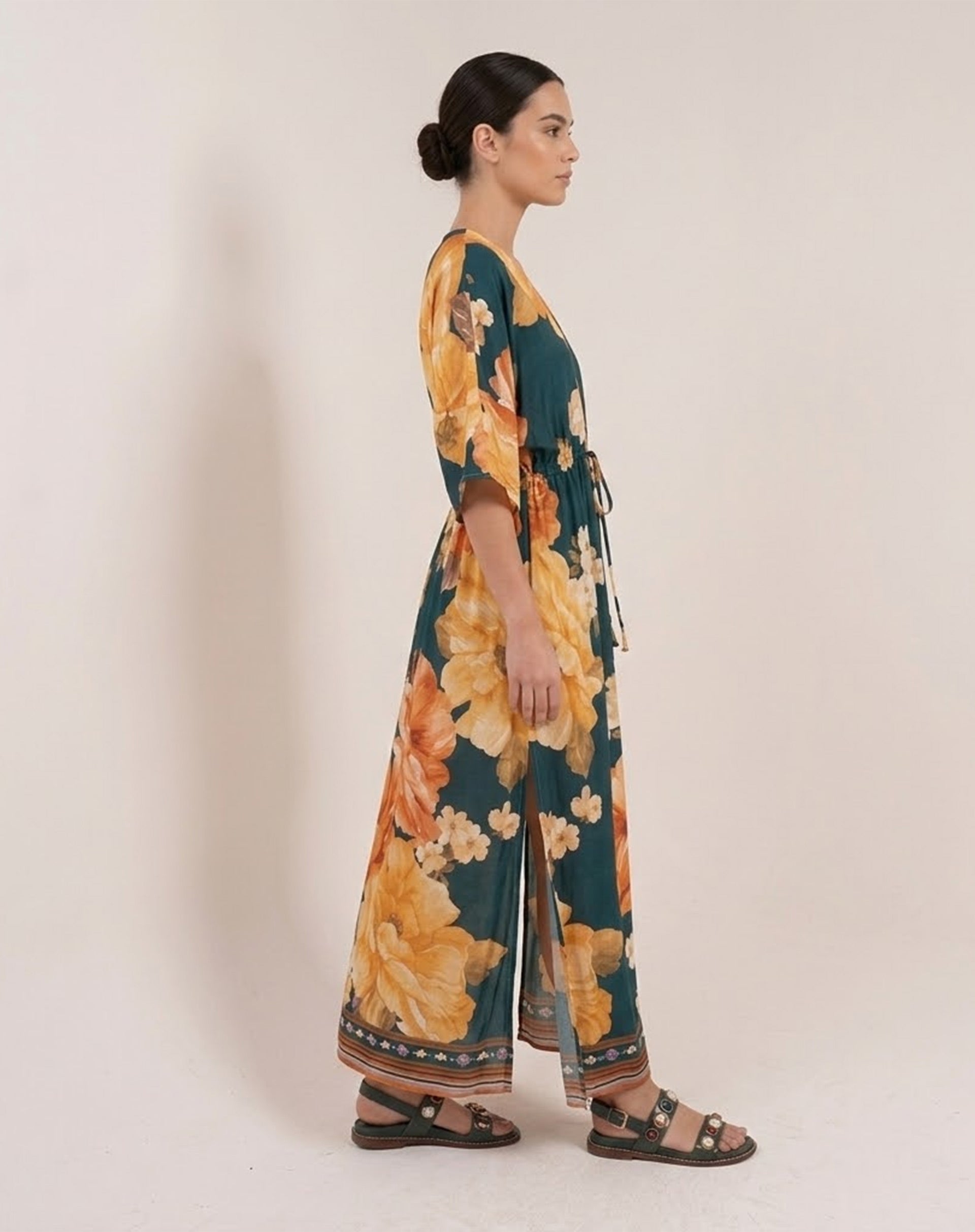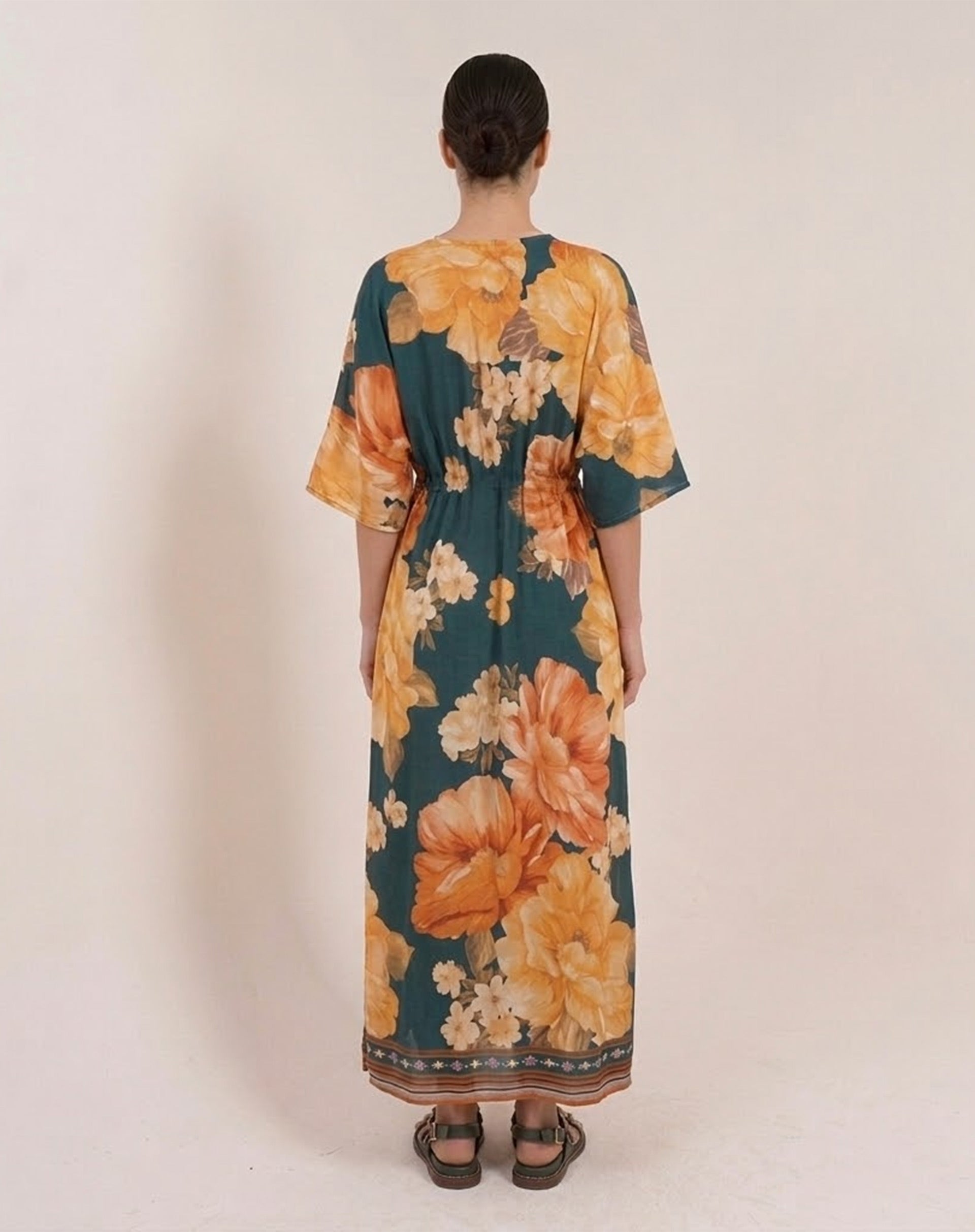 Vestido floral com decote V que valoriza o colo com delicadeza. Confeccionado em viscose, tem toque macio, caimento leve e é super fresquinho, perfeito para dias quentes com conforto e feminilidade.