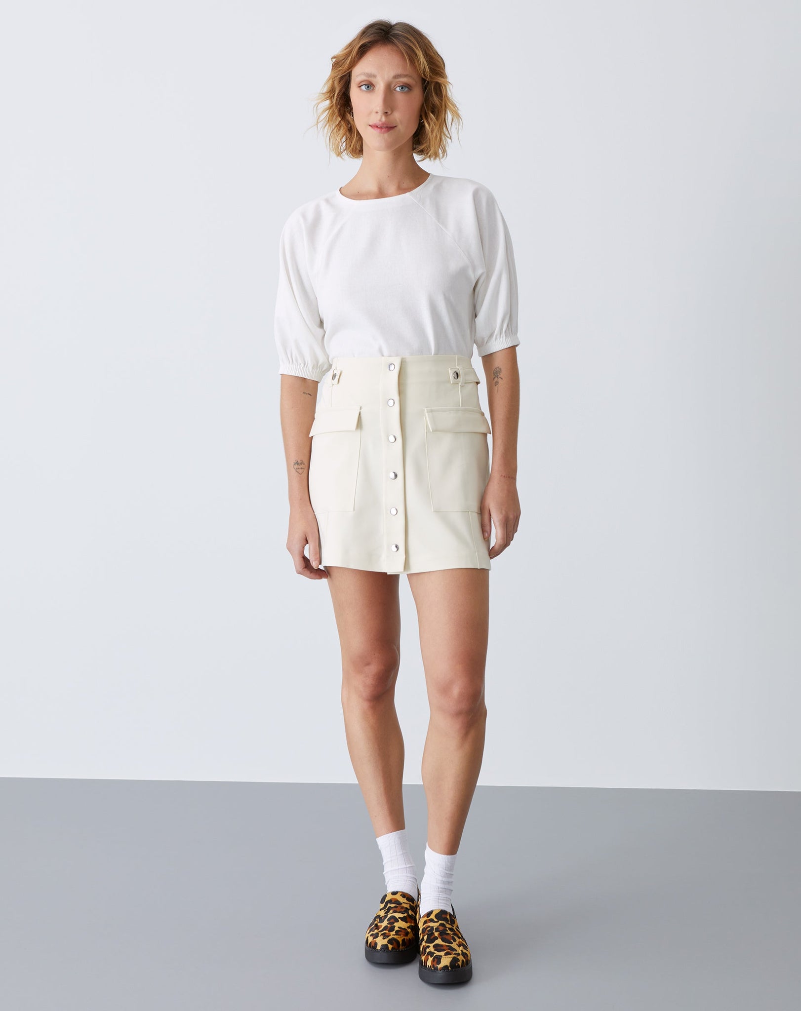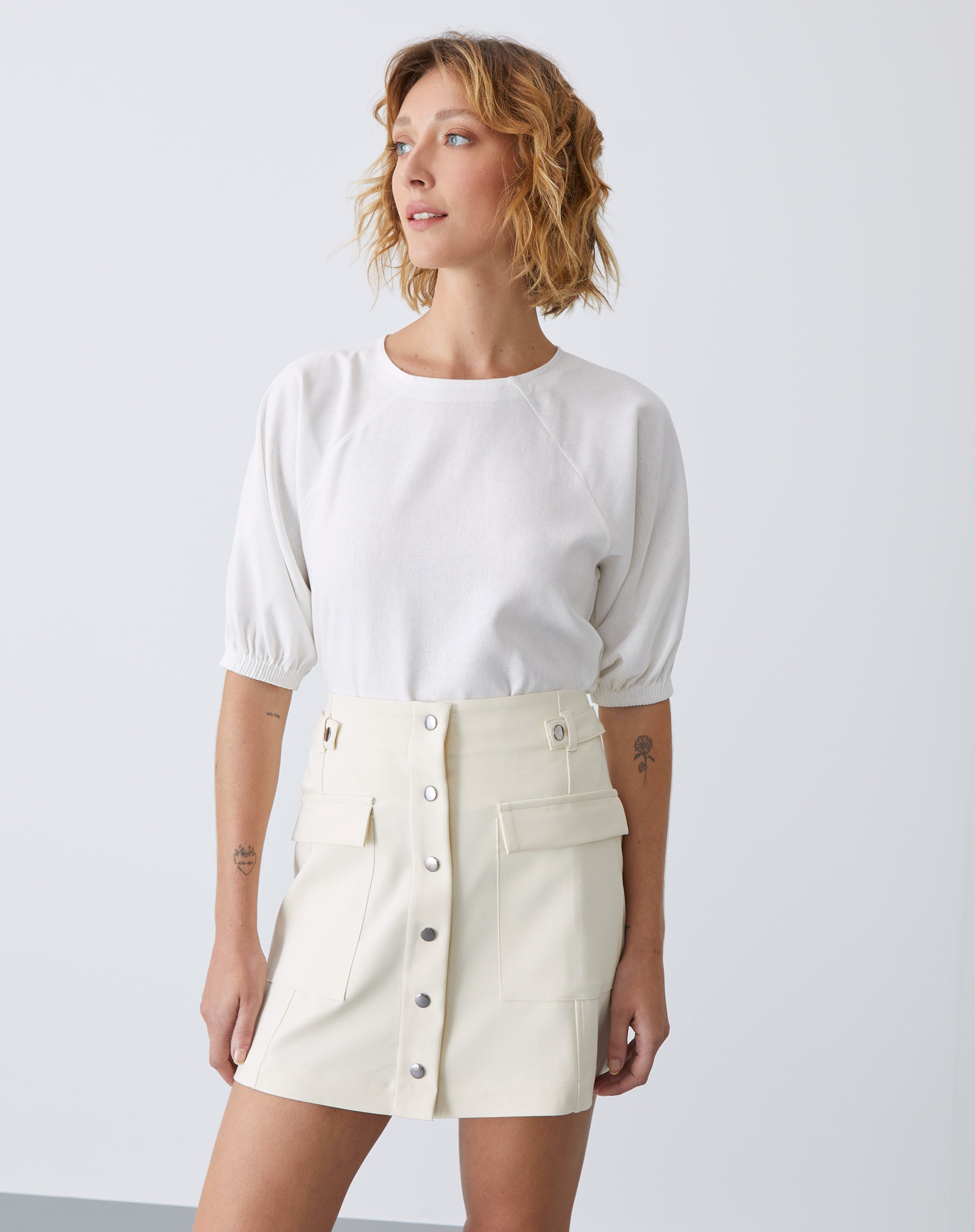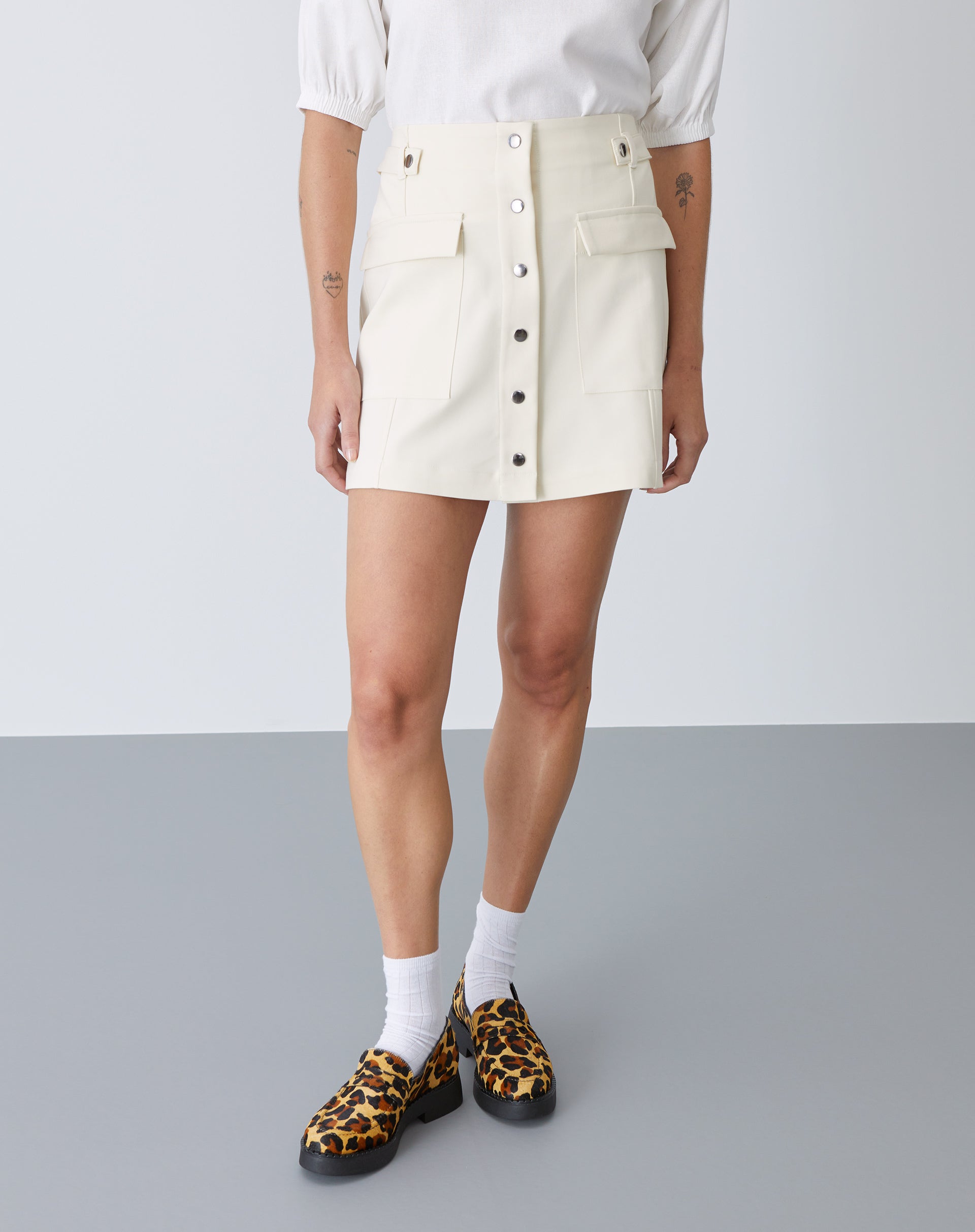 Saia curta em alfaiataria, perfeita para ocasiões arrumadas. Cintura alta sem cós e fechamento, comprimento curto. Peça versátil e moderna para um look urbano.
