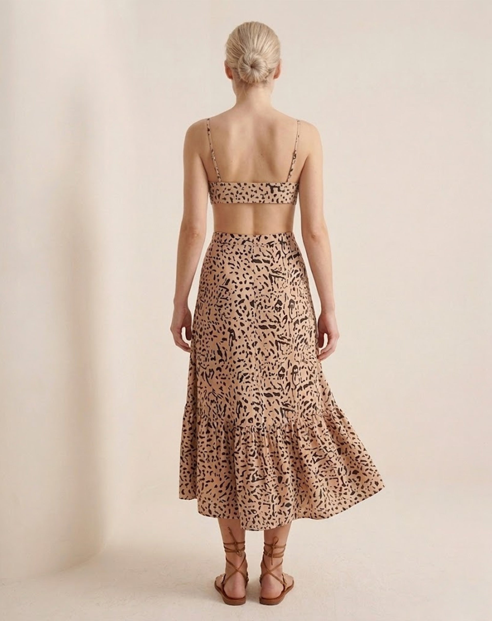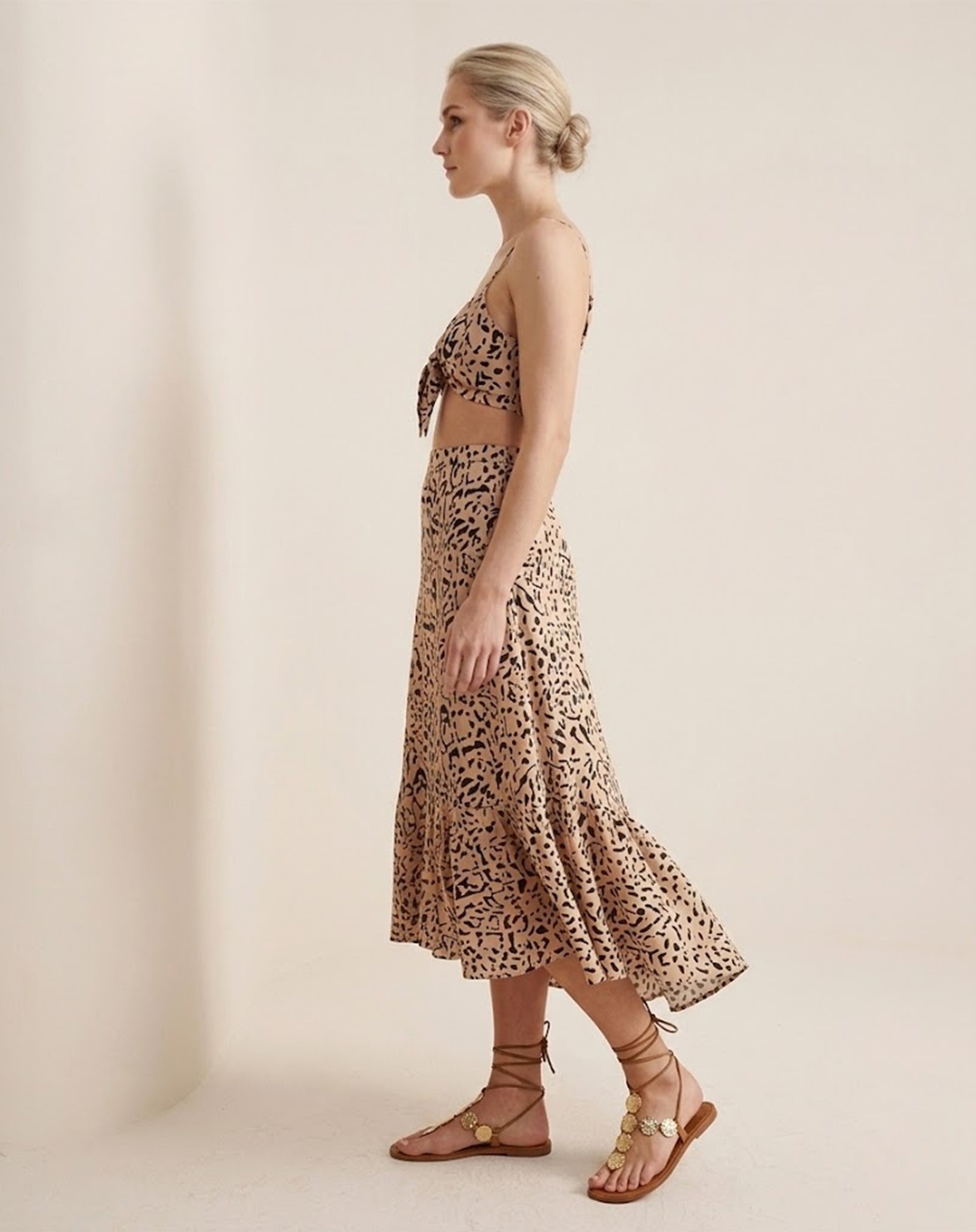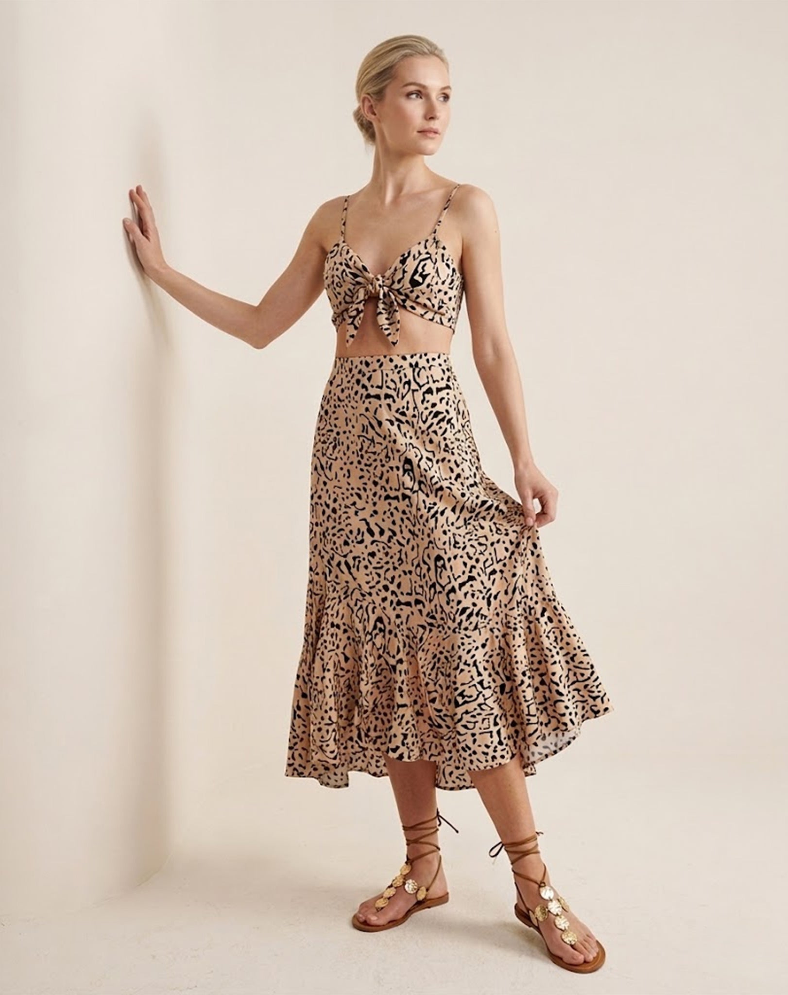 Conjunto em 100% viscose com estampa animal print, leve e fluido. Top de alças finas com amarração frontal e recorte na cintura, combinado à saia midi com caimento solto e babado na barra. Fresco, confortável e perfeito para produções elegantes e cheias de personalidade.