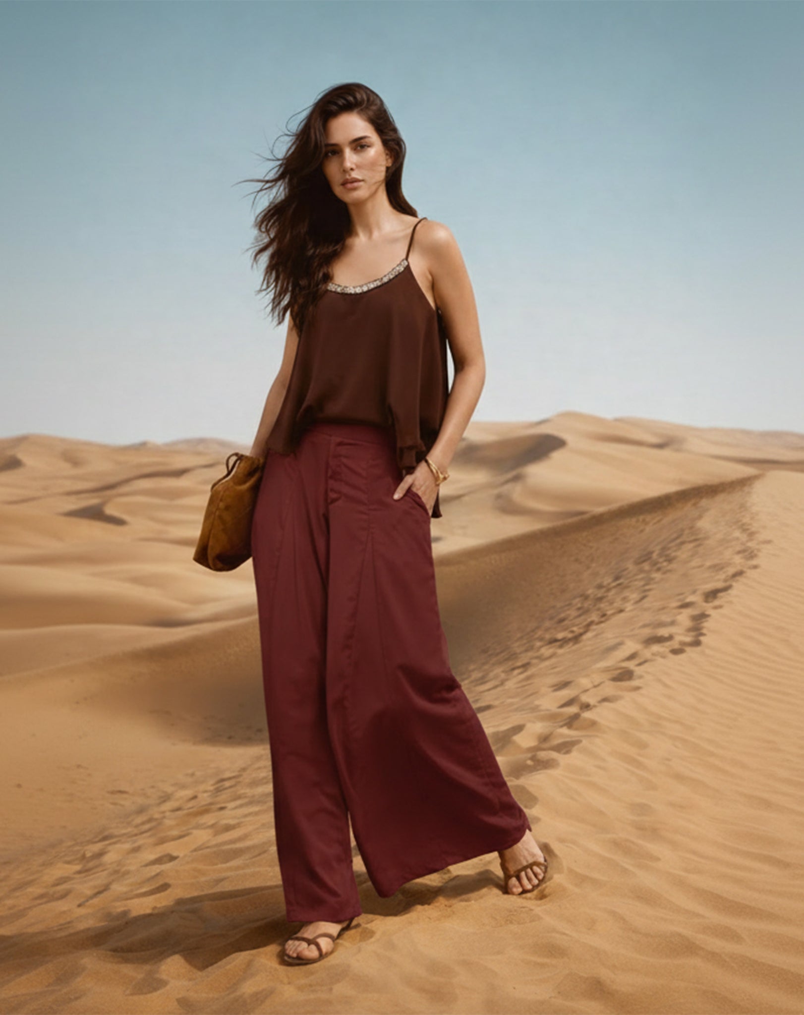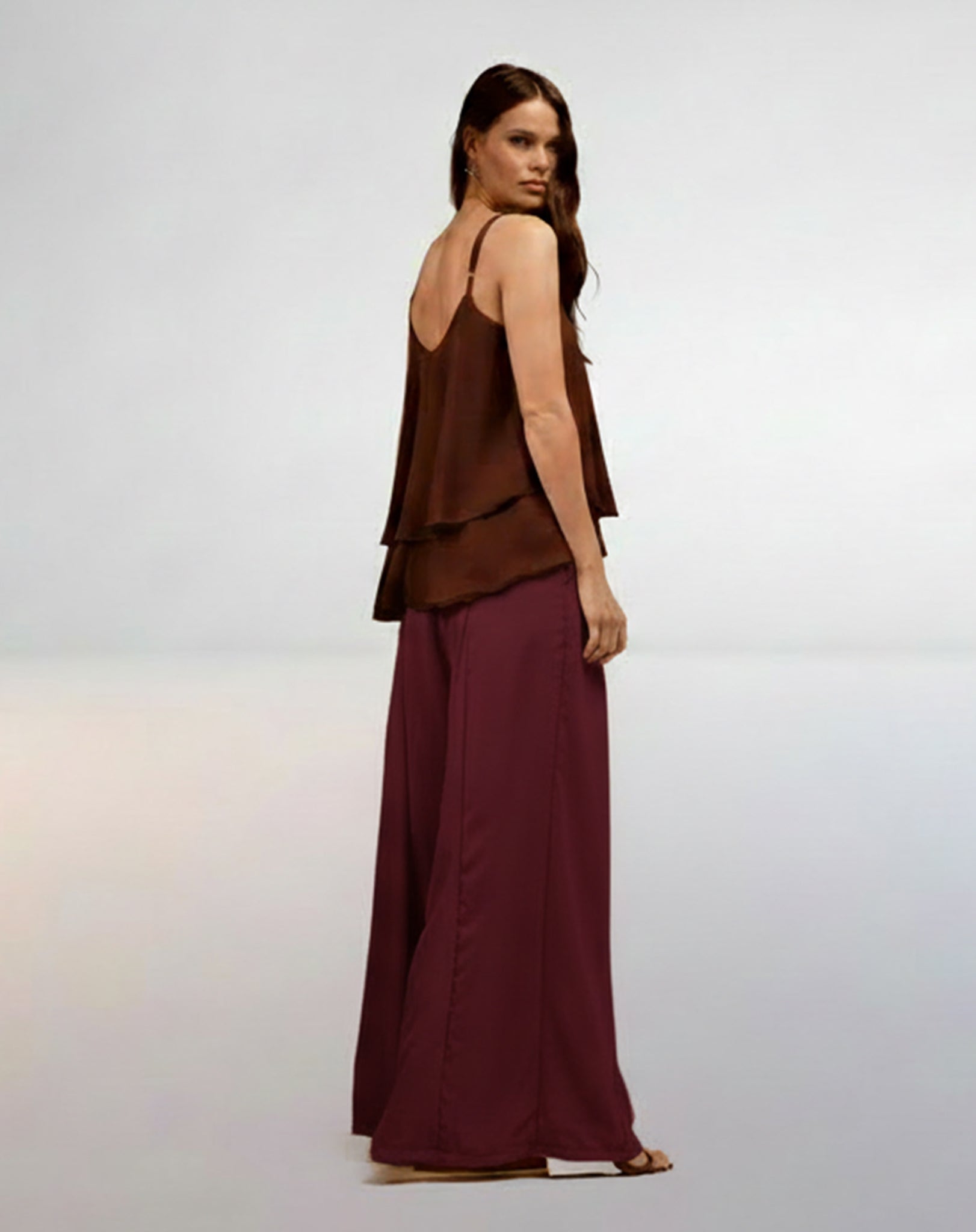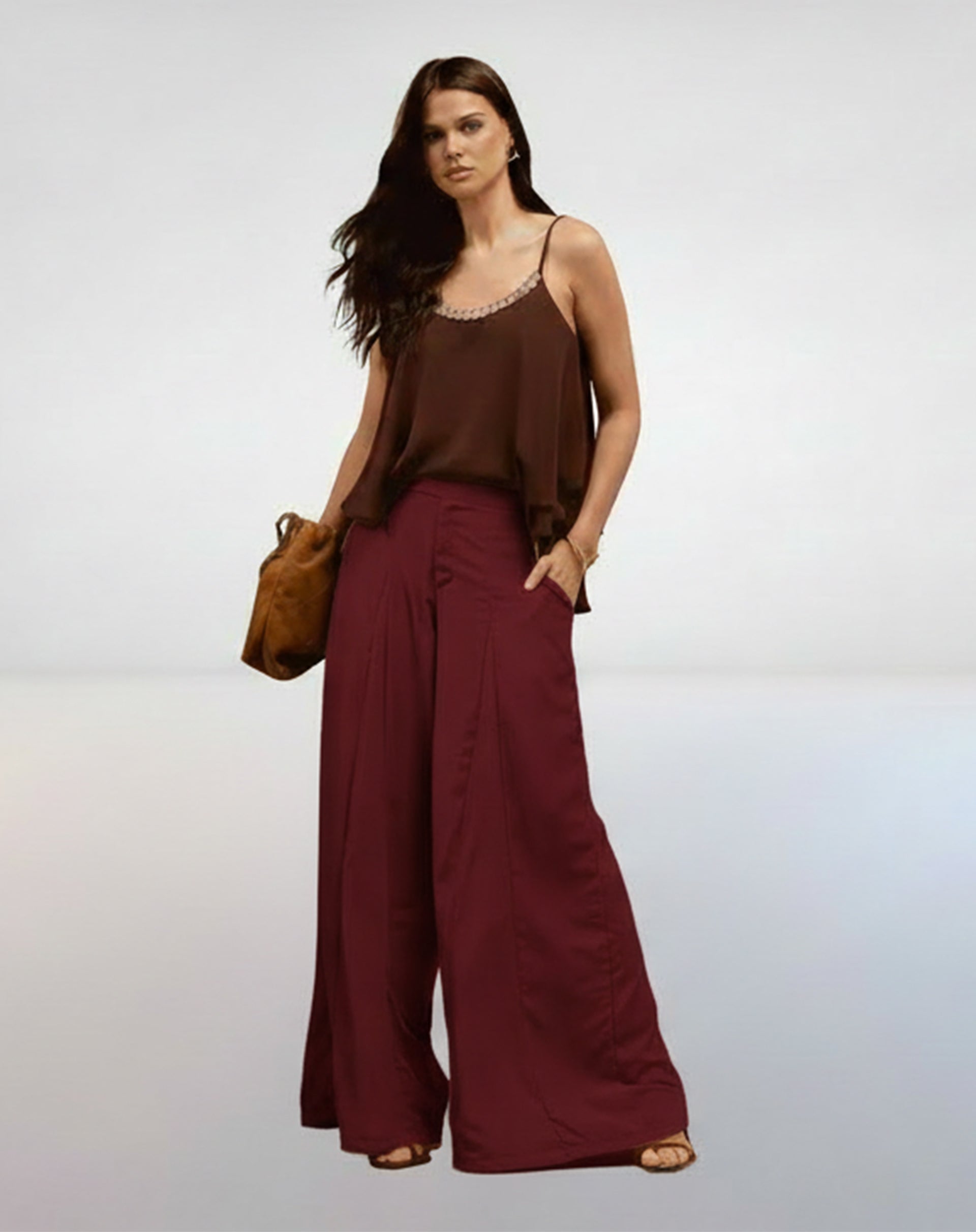 Calça Pantalona de Alfaiataria em poliéster com cós transpassado, caimento fluido e modelagem ampla que alonga a silhueta. Uma peça elegante e versátil para composições refinadas do dia à noite.