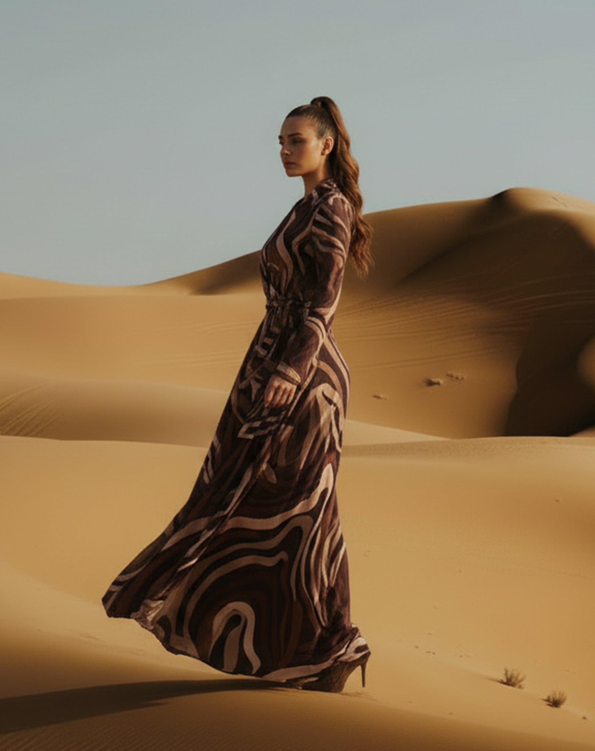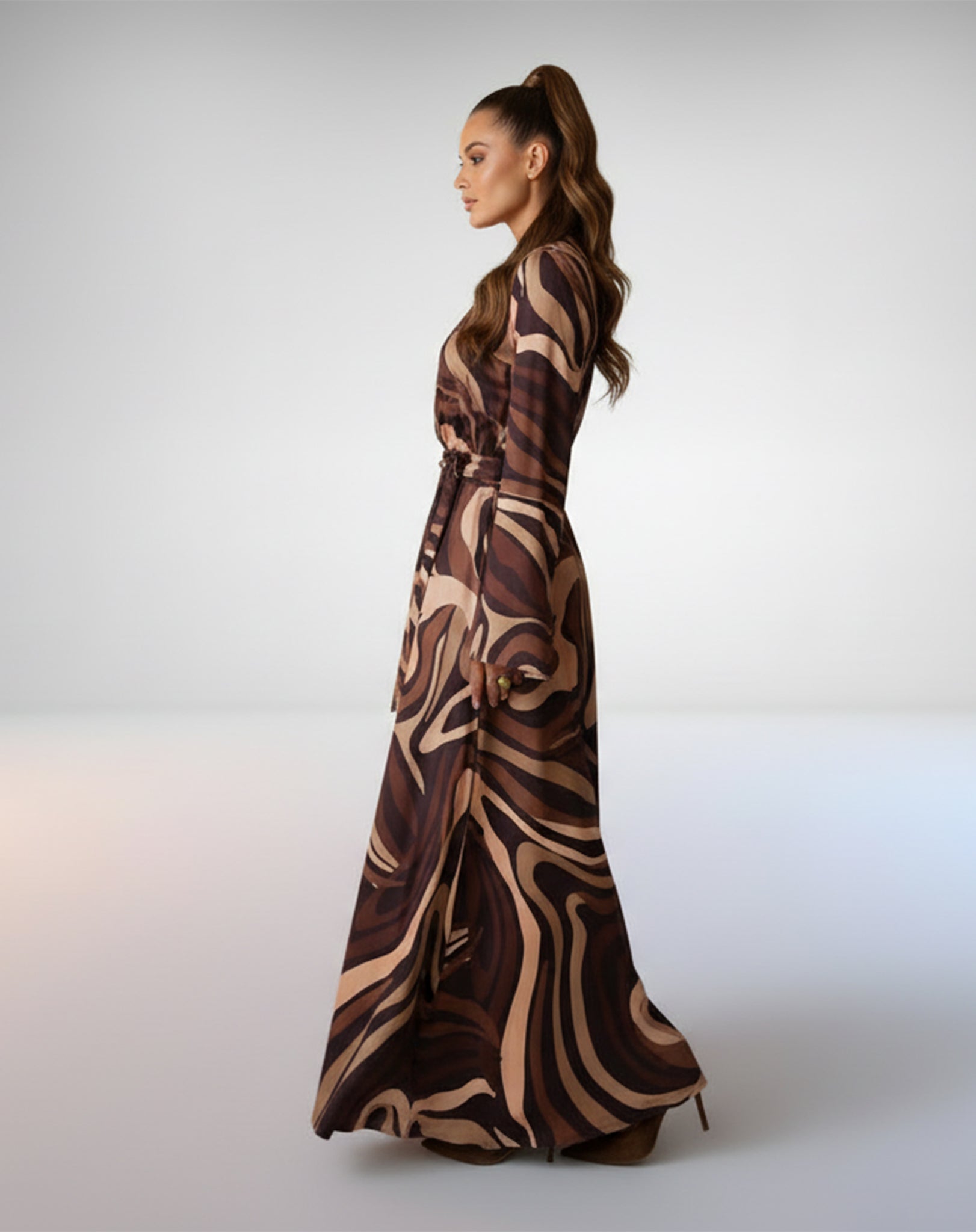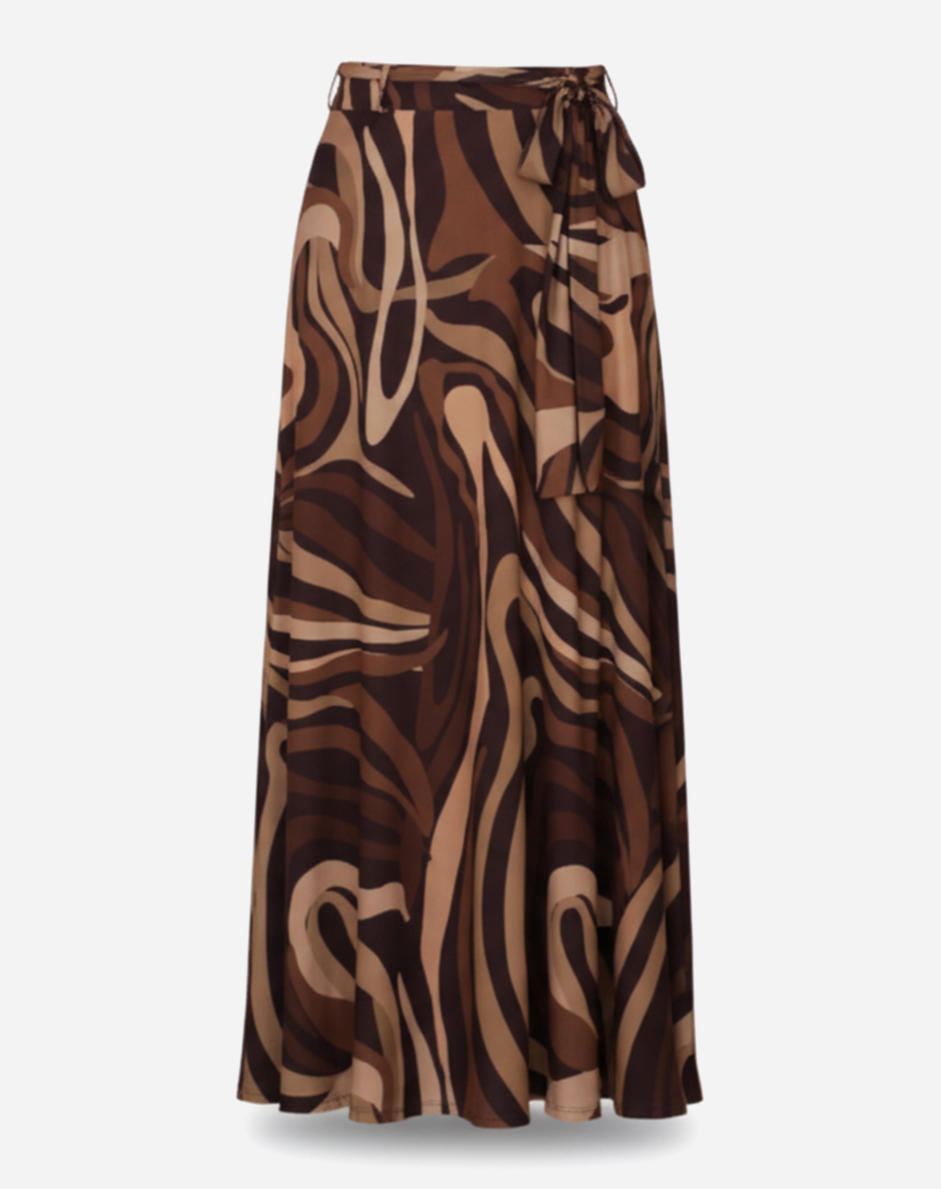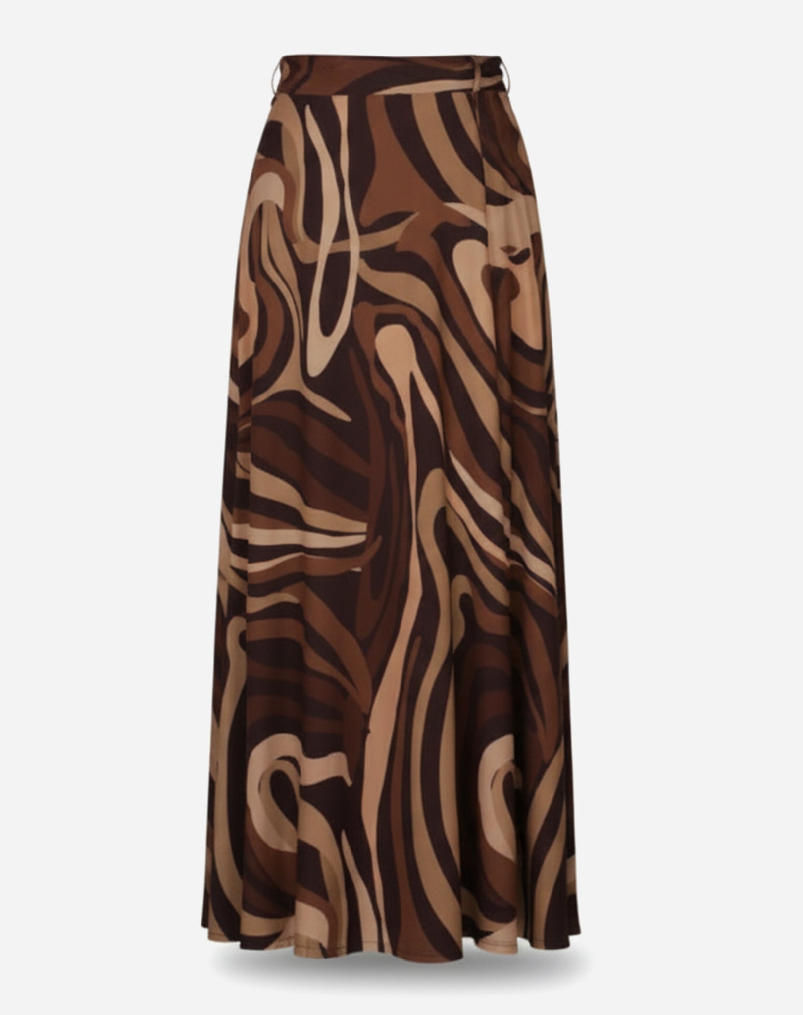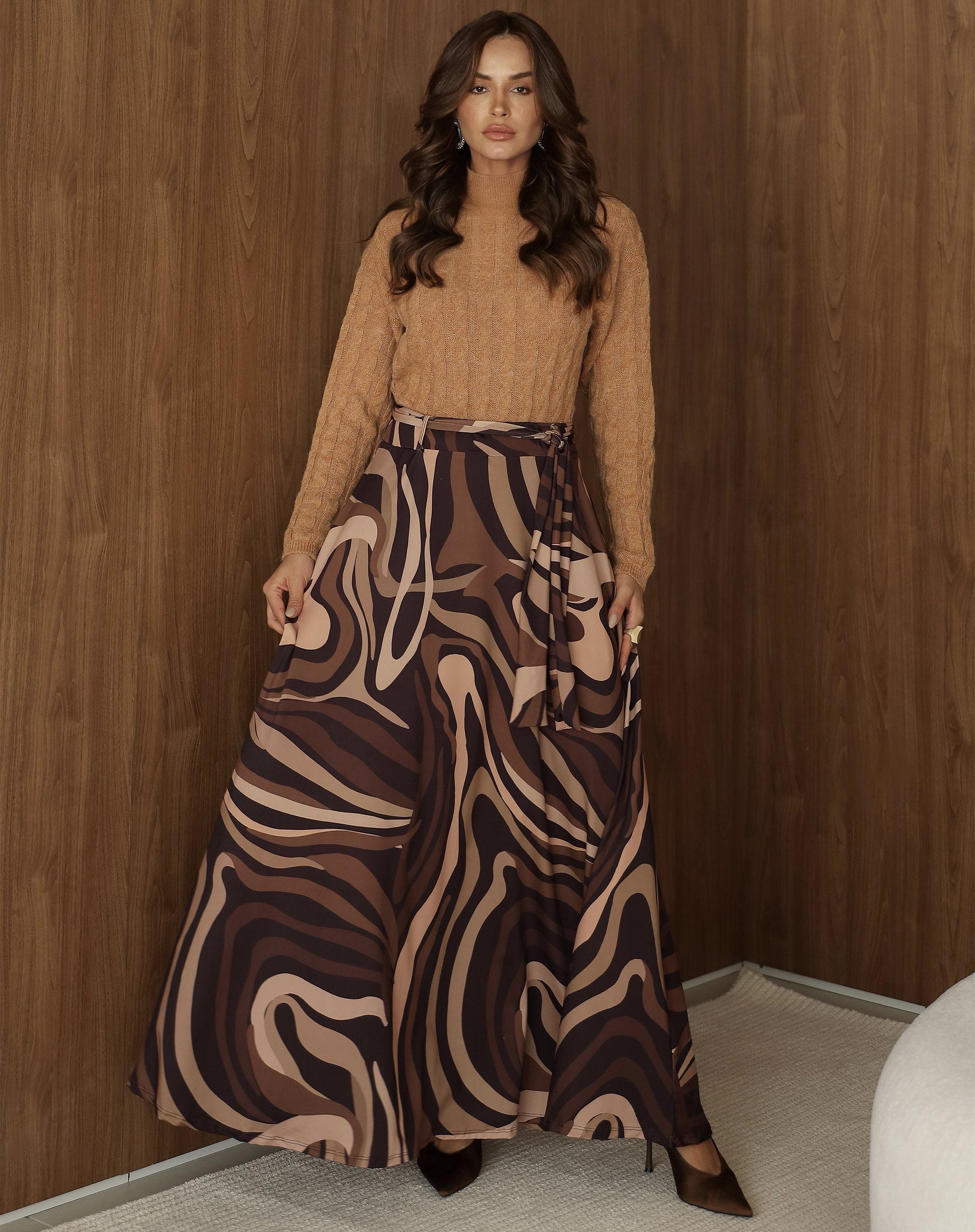 Saia Longa Fluida com cinto faixa, feita em malha fria e caimento leve. É a peça ideal para composições confortáveis sem perder o estilo. Sua estampa abstrata em tons de marrom facilita a combinação dessa saia com qualquer outra peça.
