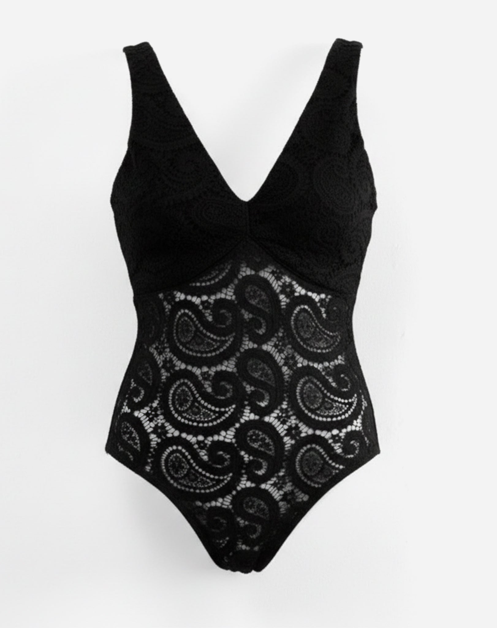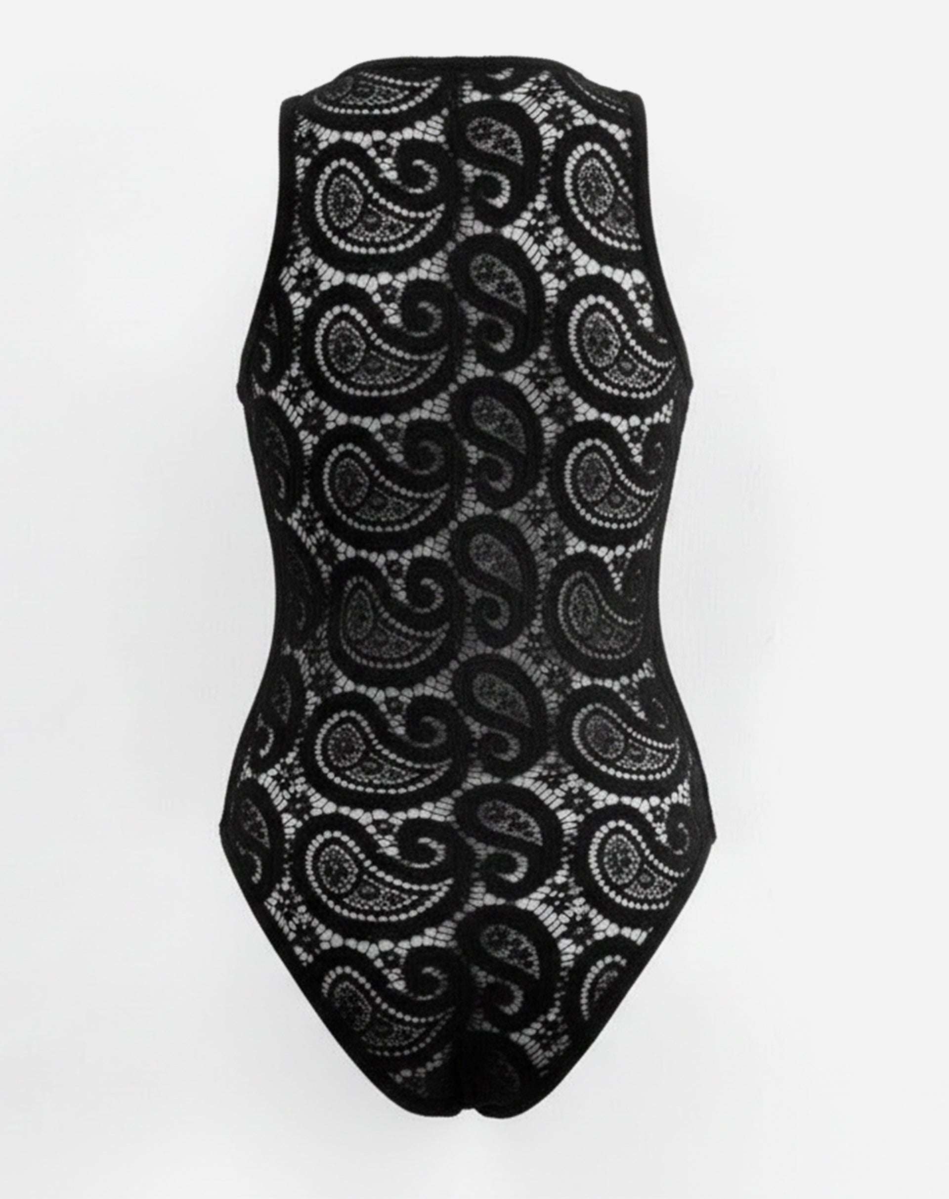 Body com Decote V e detalhe de torção frontal em renda. Feminino e elegante, valoriza a silhueta com transparência sutil e acabamento delicado.