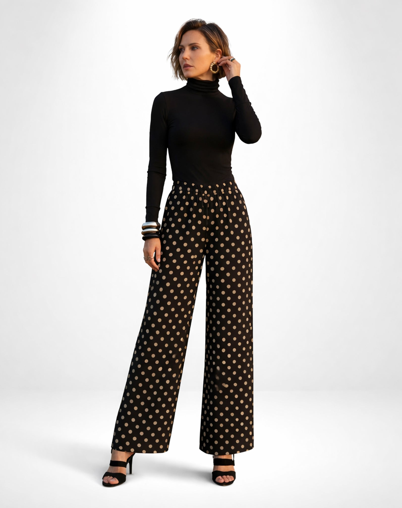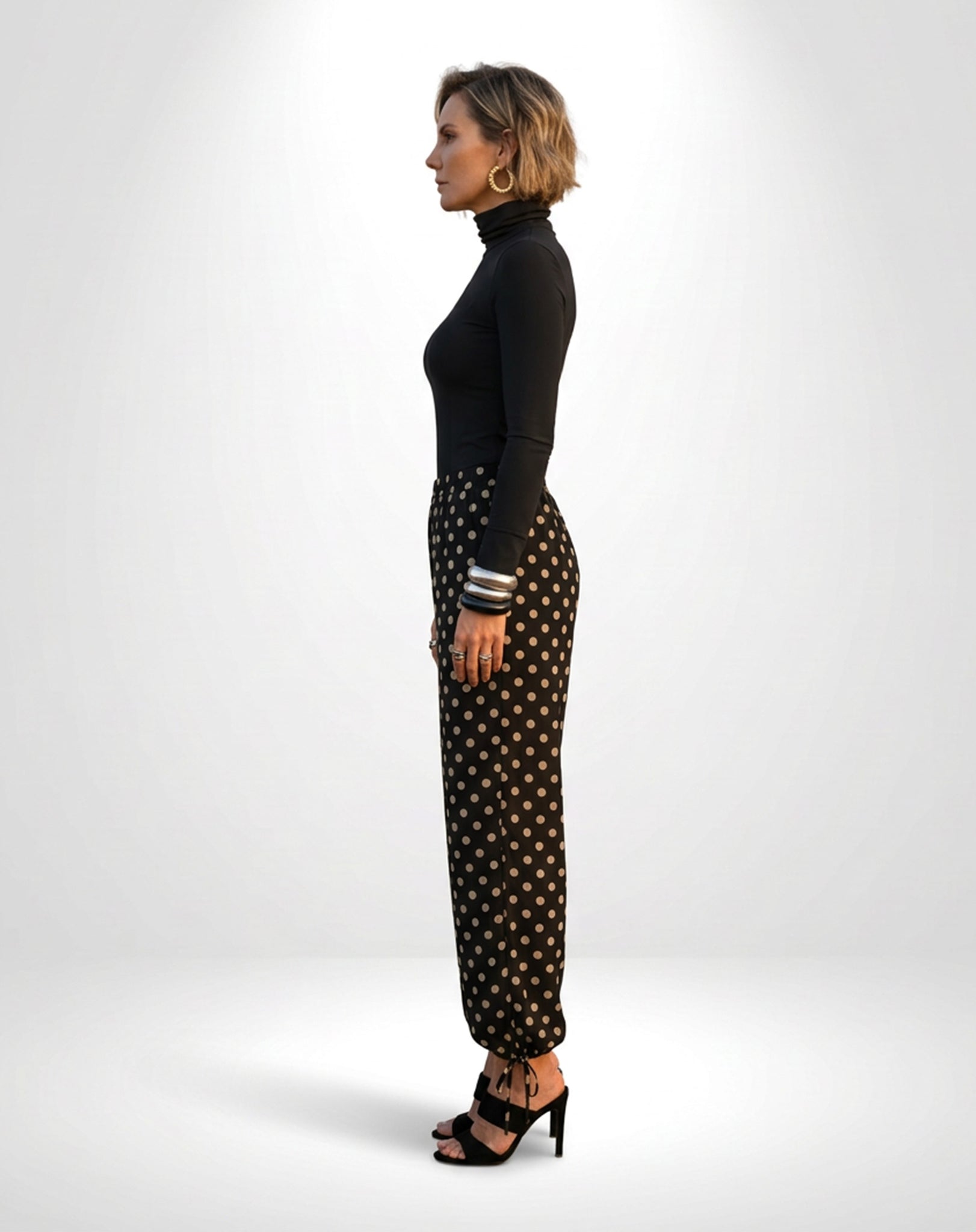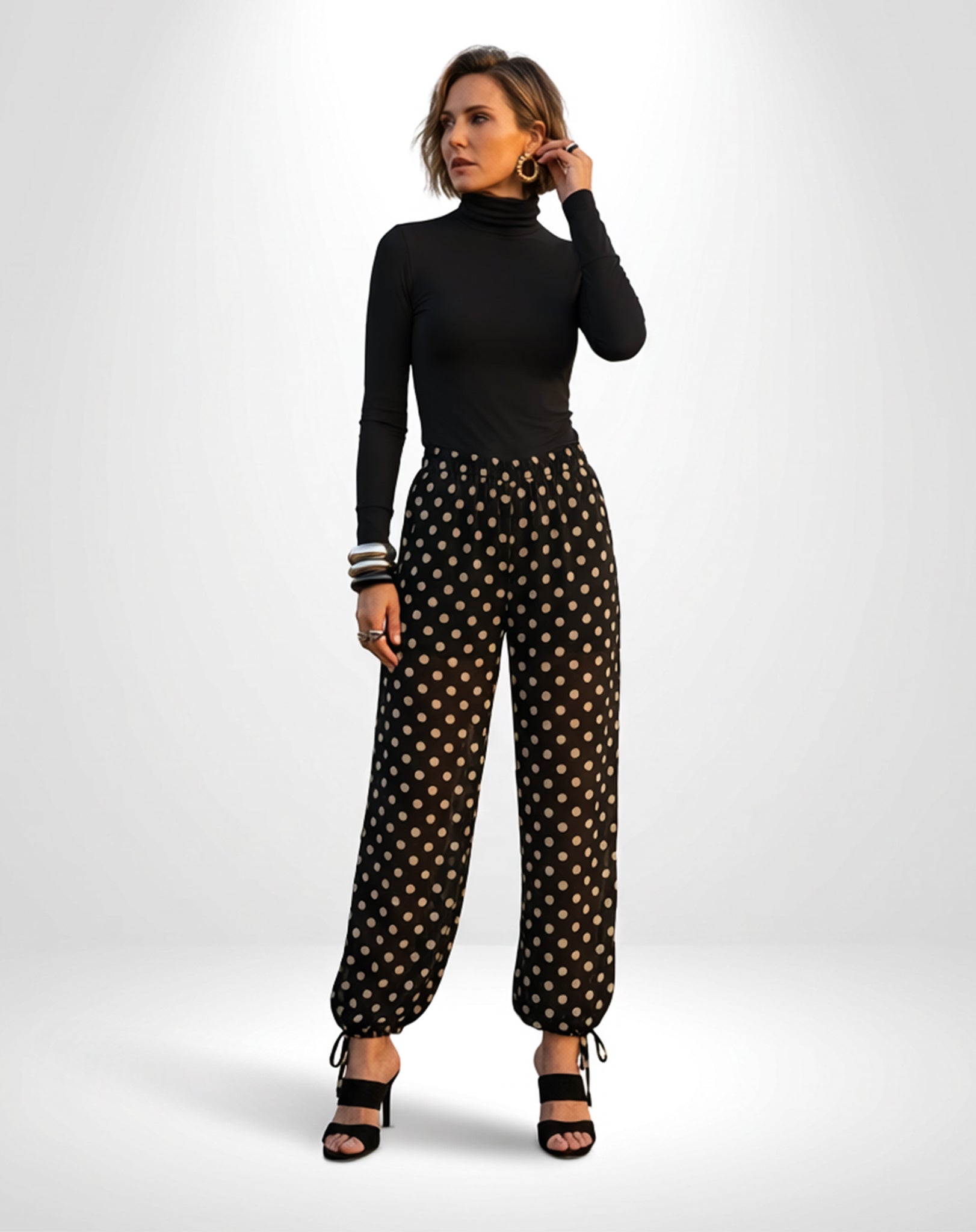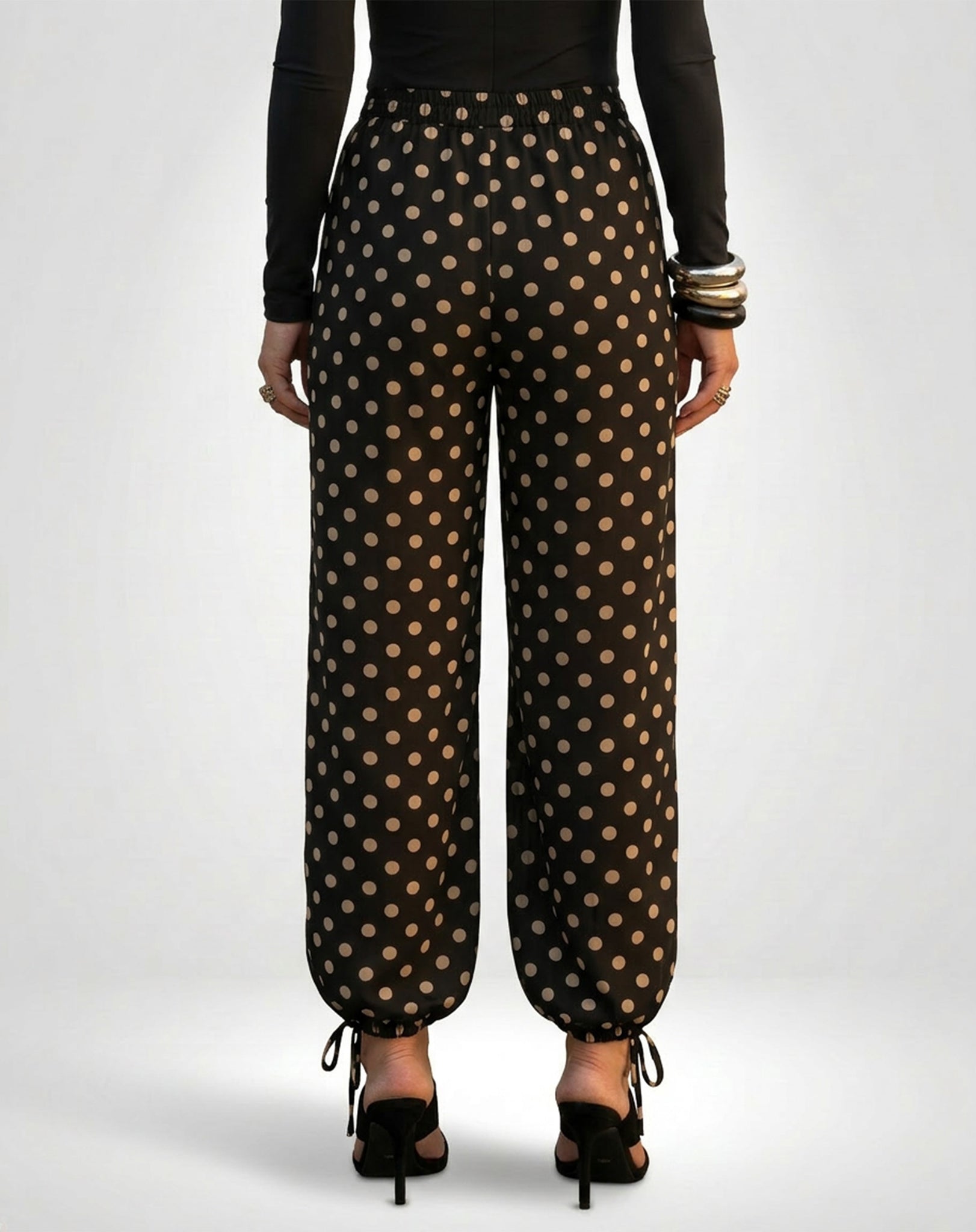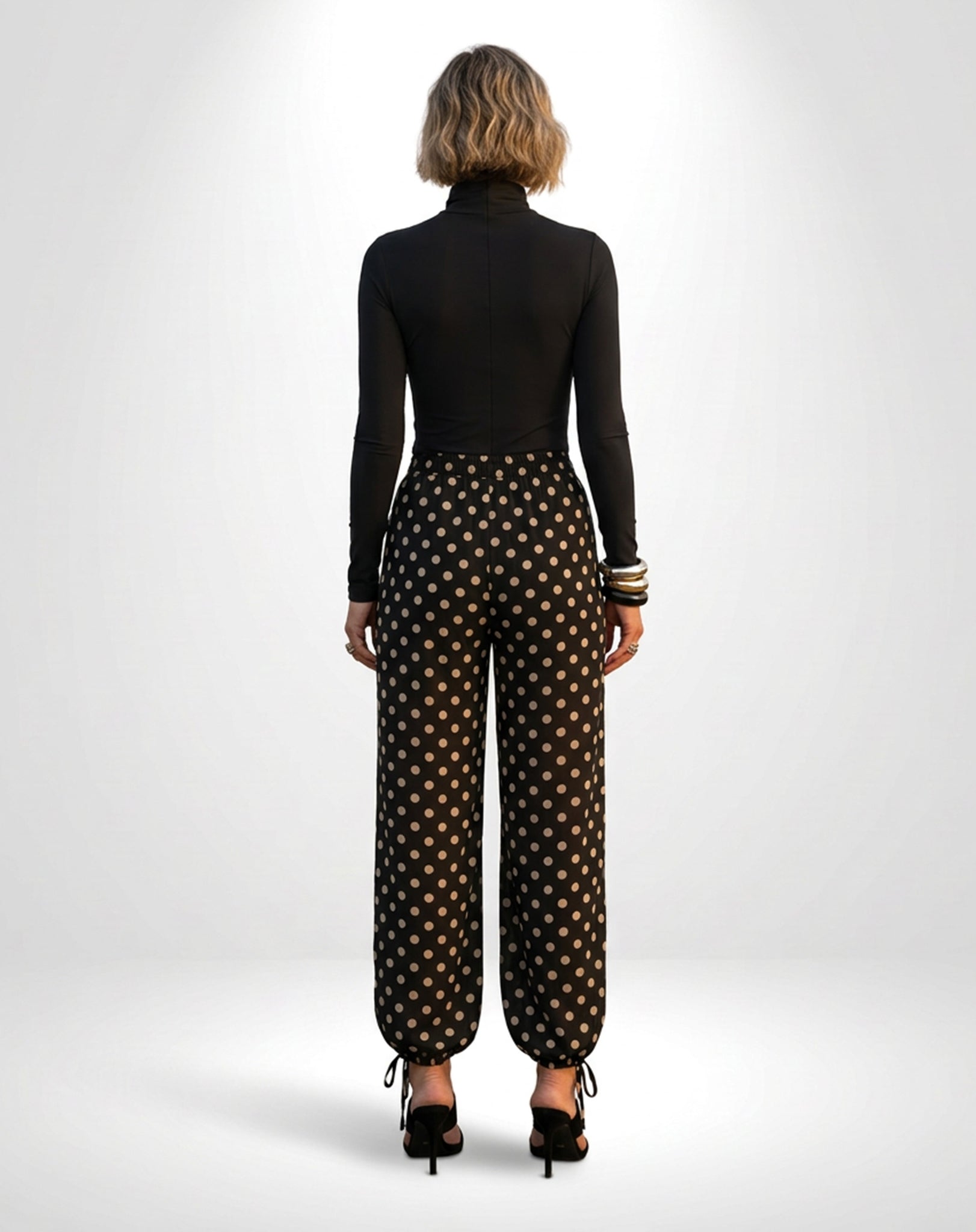 A amarração nos punhos permite diferentes formas de uso: mais ajustada, criando um efeito estilo “aladim”, ou solta, para um visual mais amplo e semelhante à pantalona. Ideal para composições versáteis, do dia a dia a ocasiões especiais, com leveza e estilo.