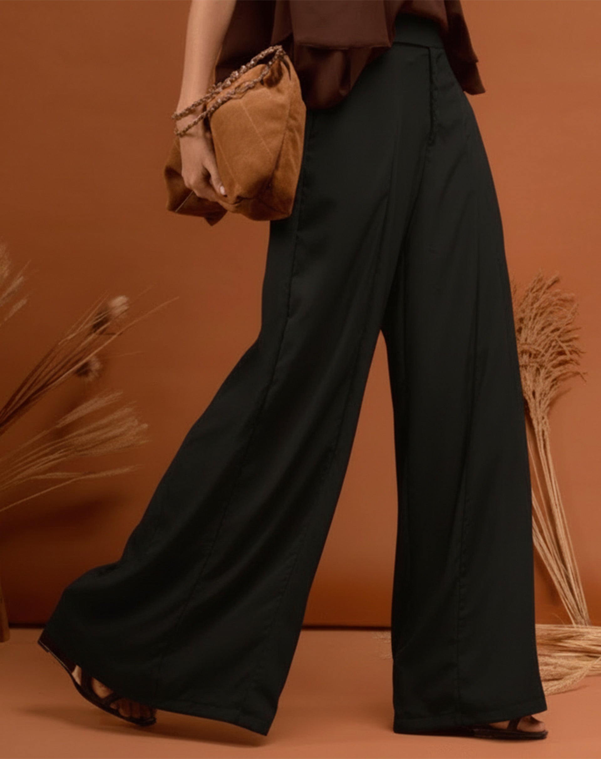 Calça Pantalona de Alfaiataria em poliéster com cós transpassado, caimento fluido e modelagem ampla que alonga a silhueta. Uma peça elegante e versátil para composições refinadas do dia à noite.