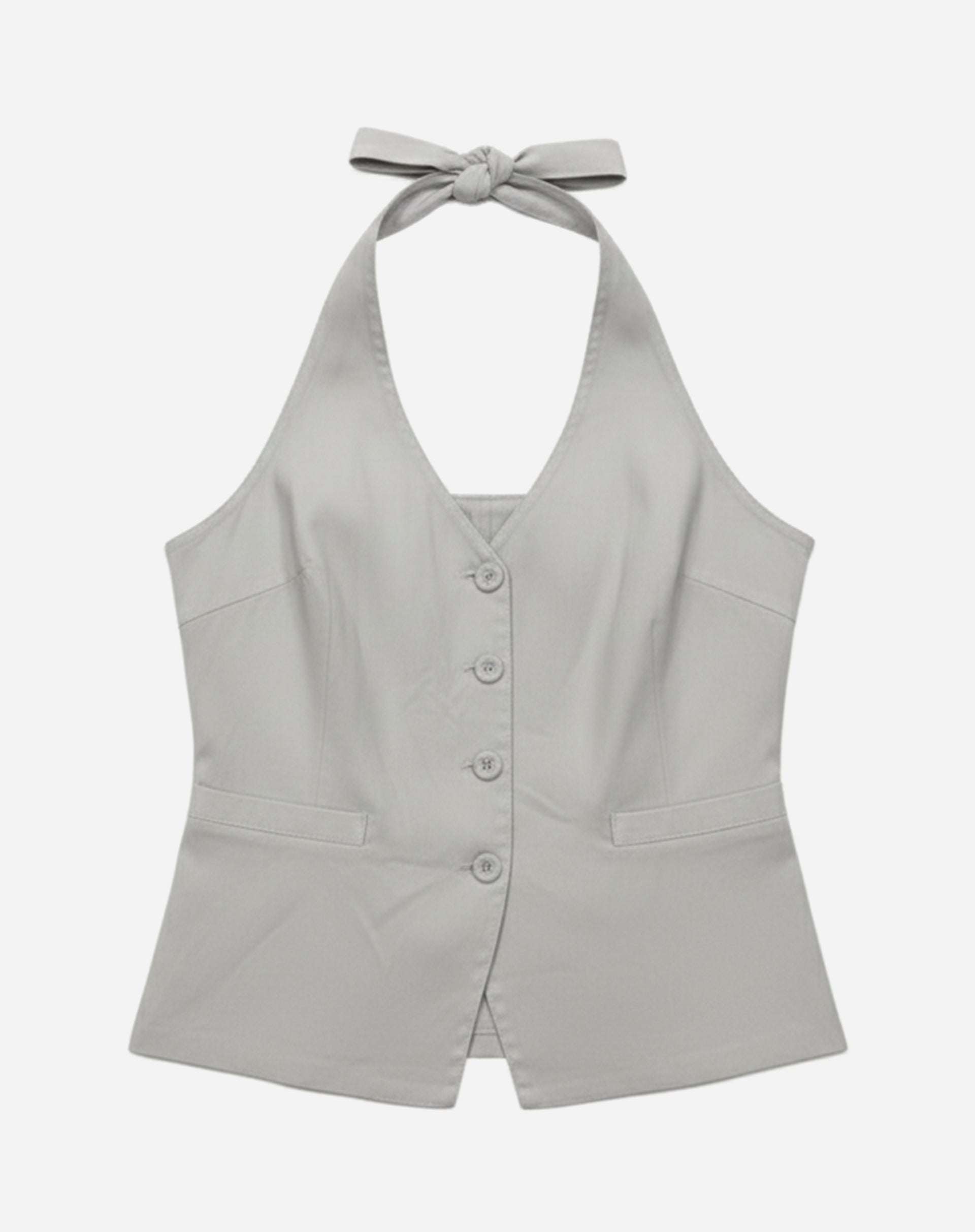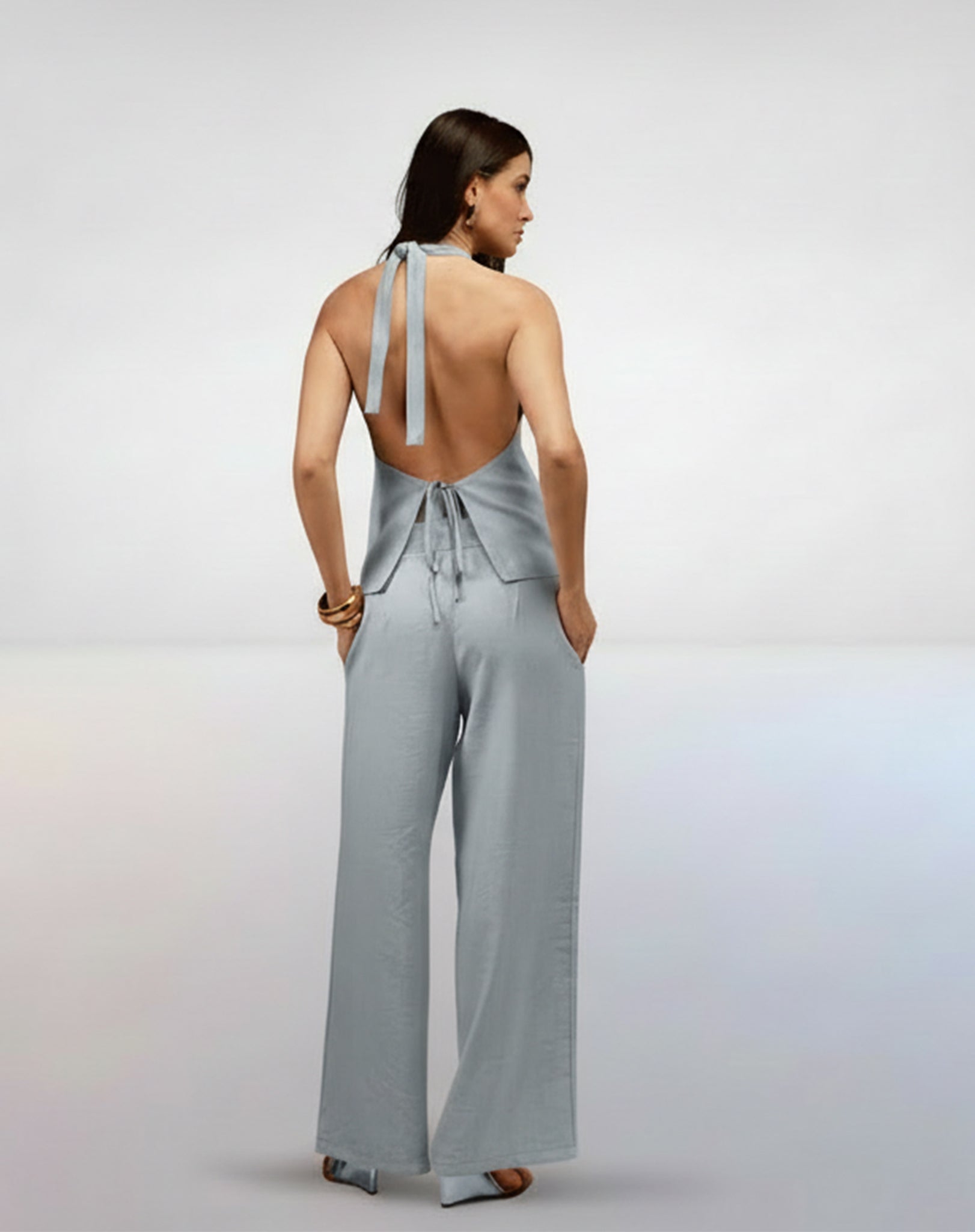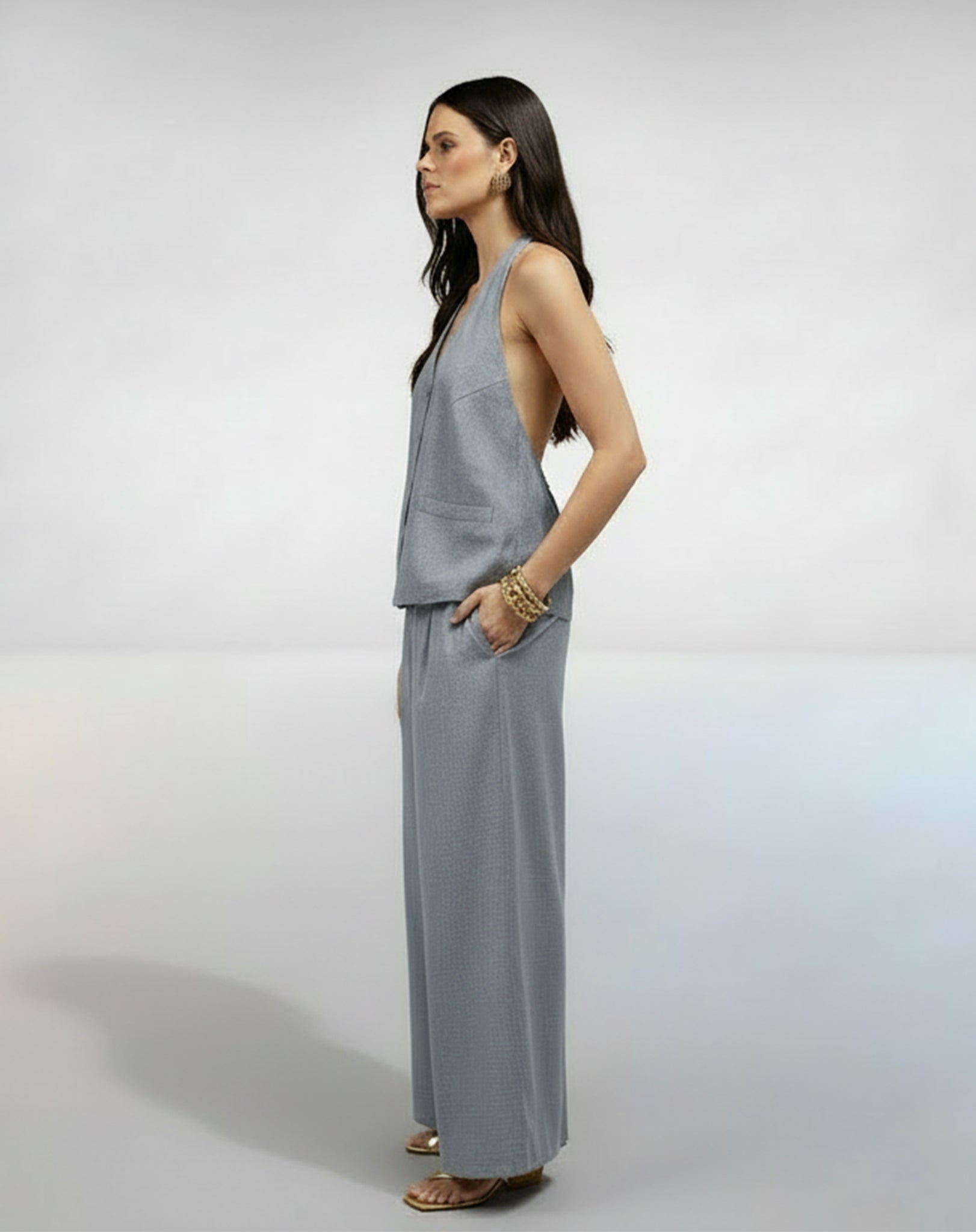 Conjunto de Alfaiataria composto por um colete frente única e calça ampla. O colete, de caimento levemente solto e amarração nas costas, faz par com uma calça wide leg com fechamento de zíper lateral. Um look sofisticado e moderno, ideal para ocasiões especiais.