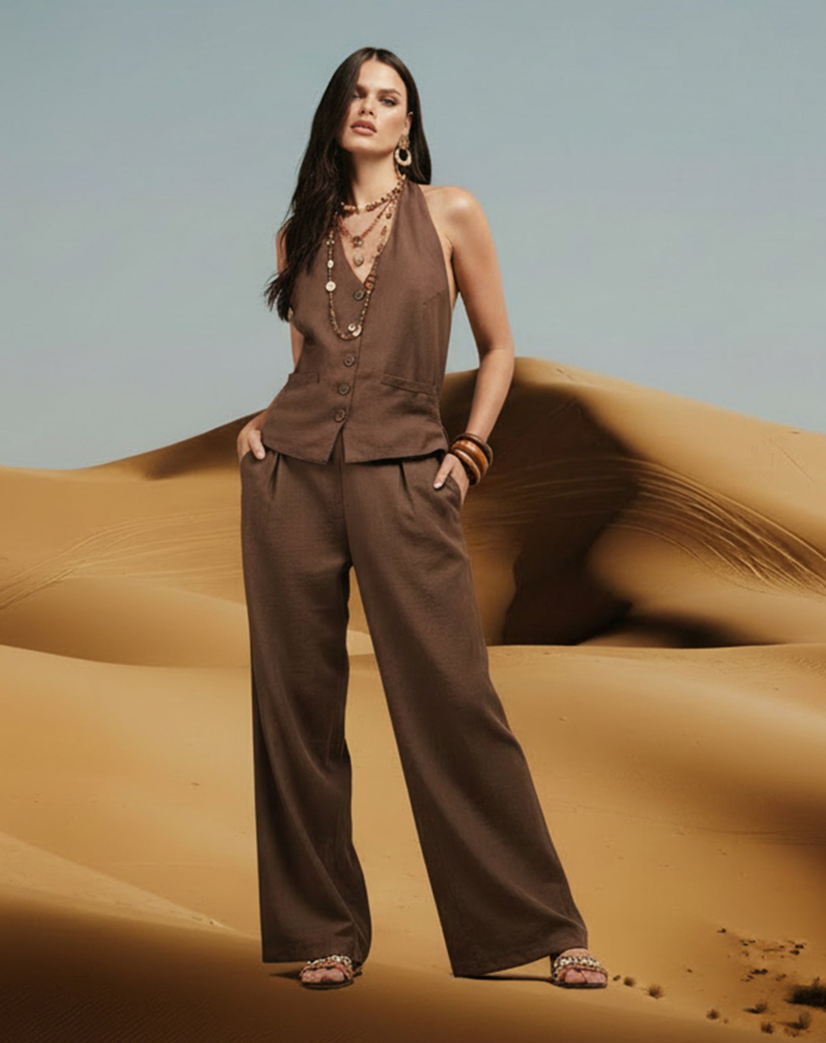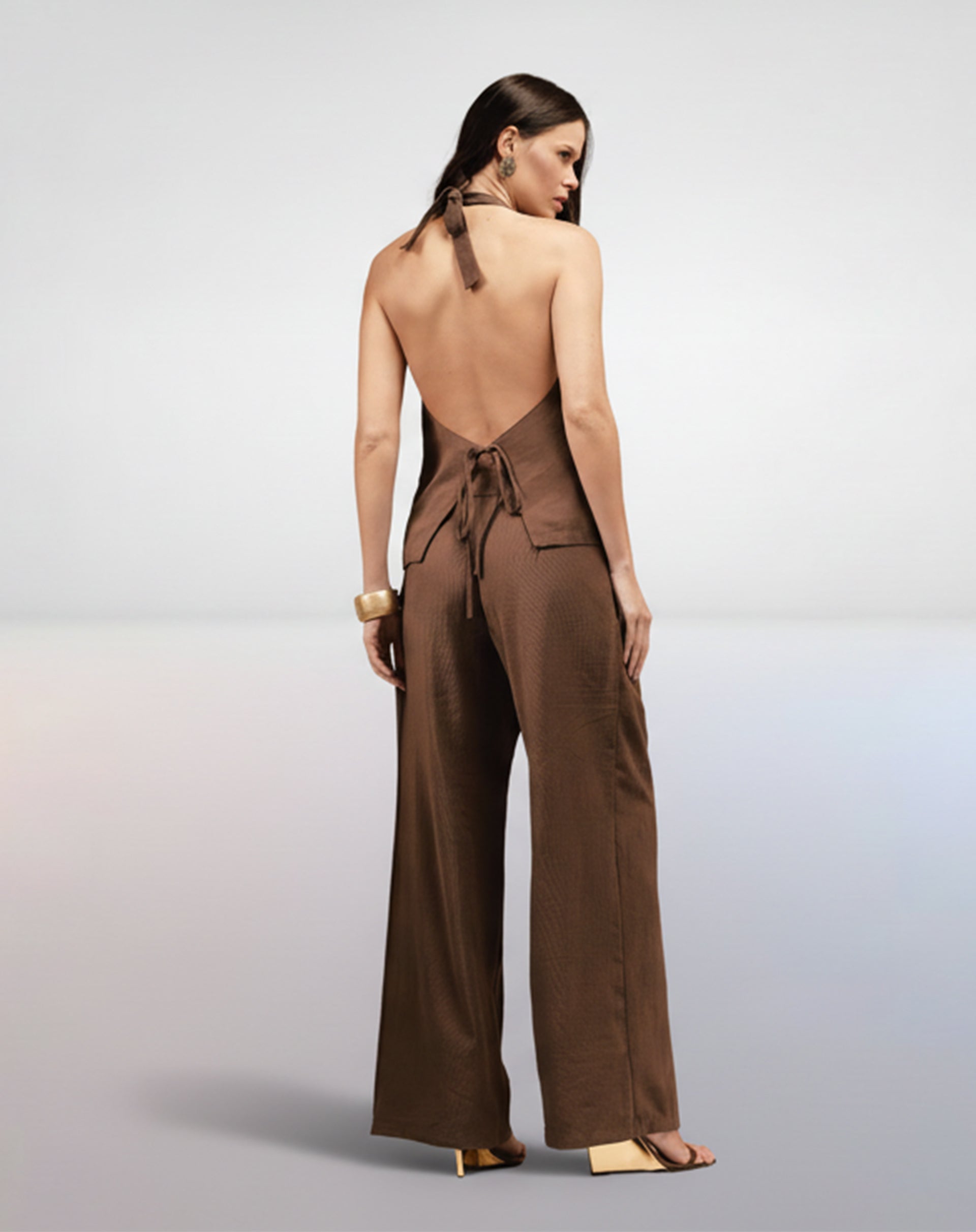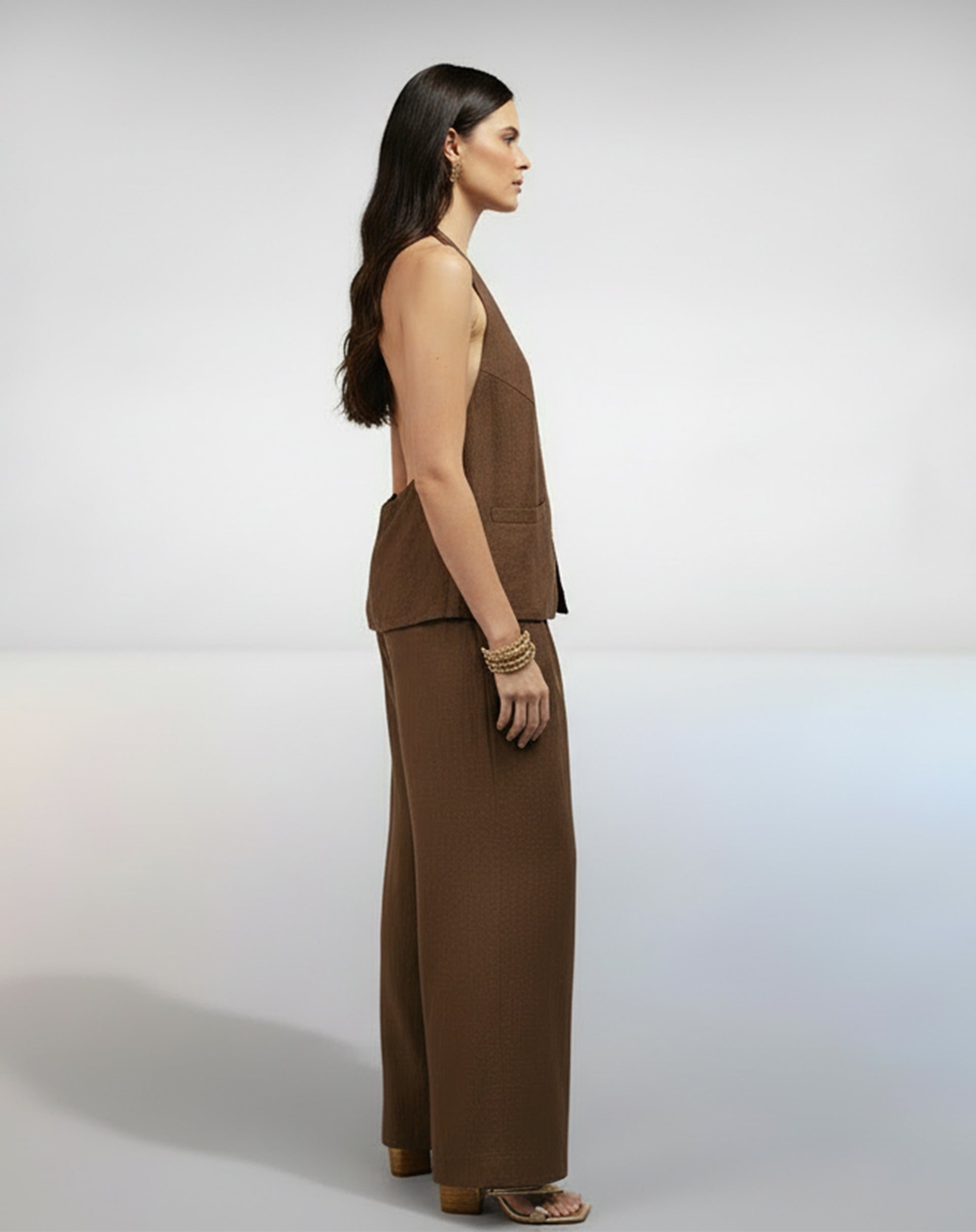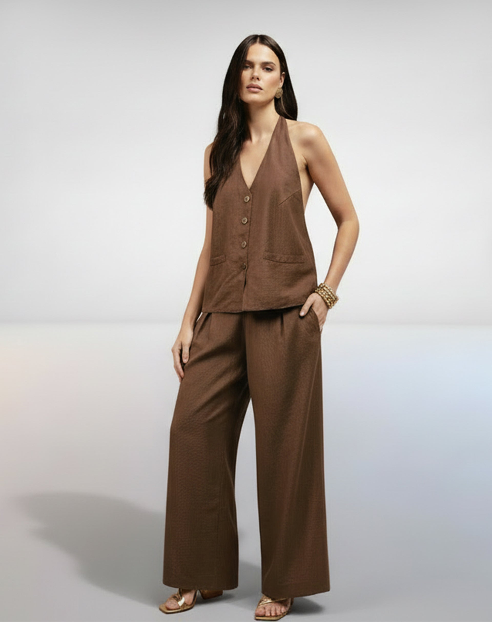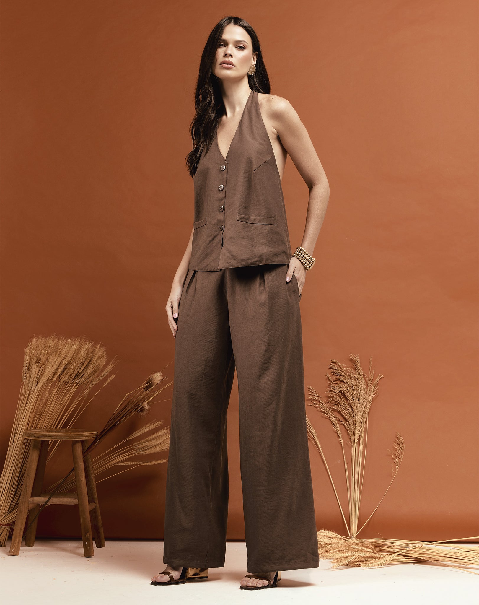 Conjunto de Alfaiataria composto por um colete frente única e calça ampla. O colete, de caimento levemente solto e amarração nas costas, faz par com uma calça wide leg com fechamento de zíper lateral. Um look sofisticado e moderno, ideal para ocasiões especiais.