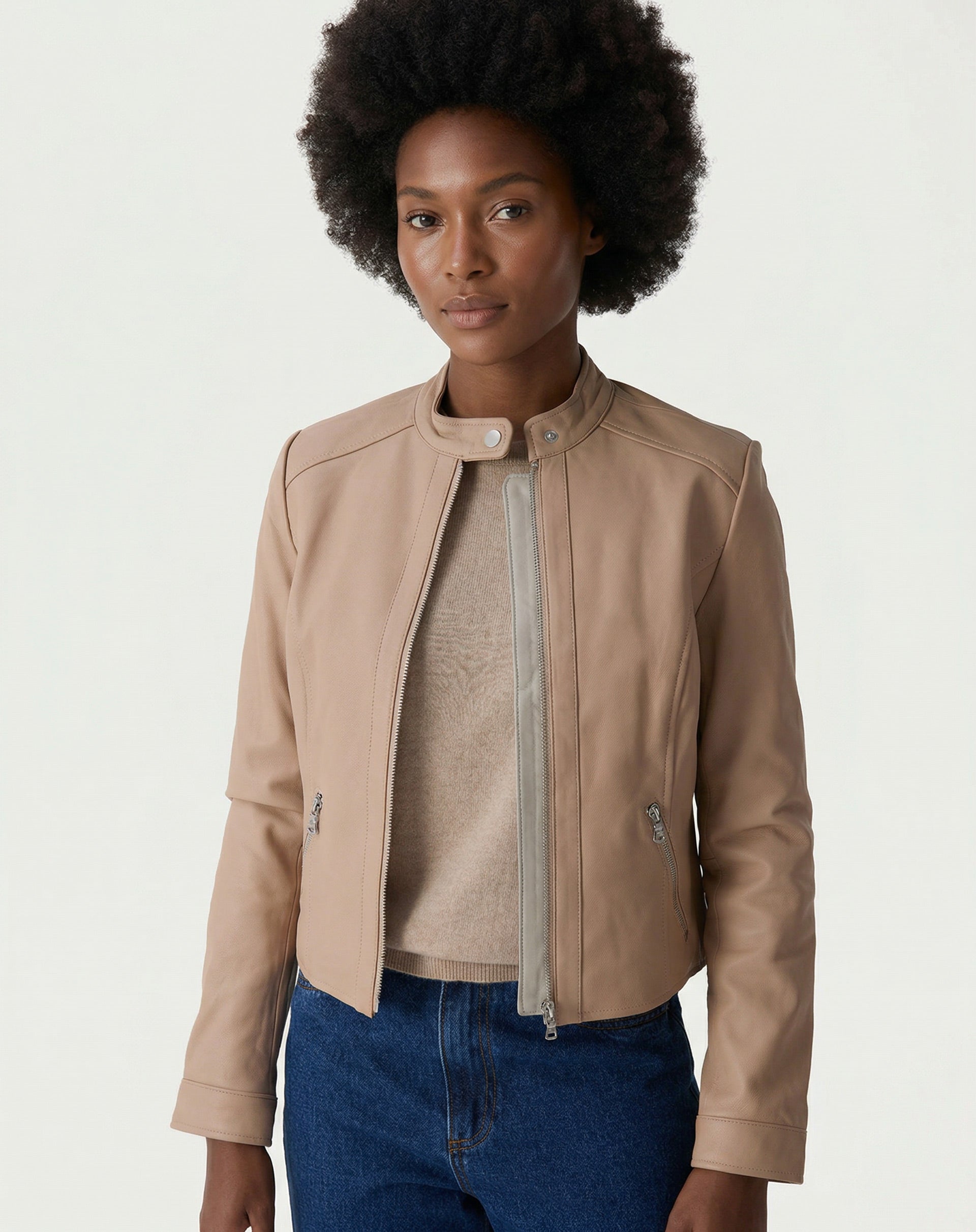 Fechamento do colarinho mandarim com botão de pressão e zíper central da jaqueta de couro pelica rosa claro.