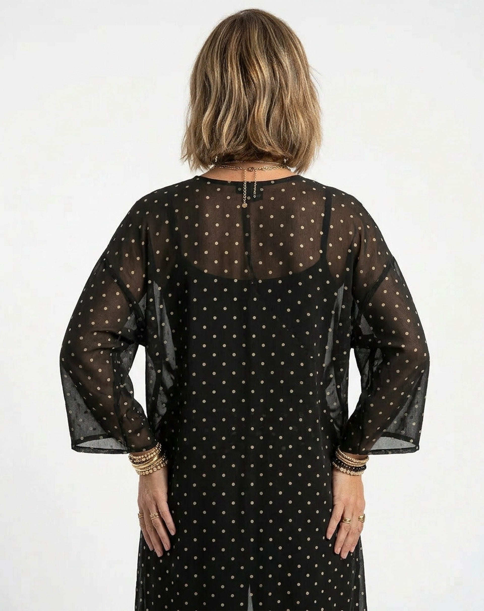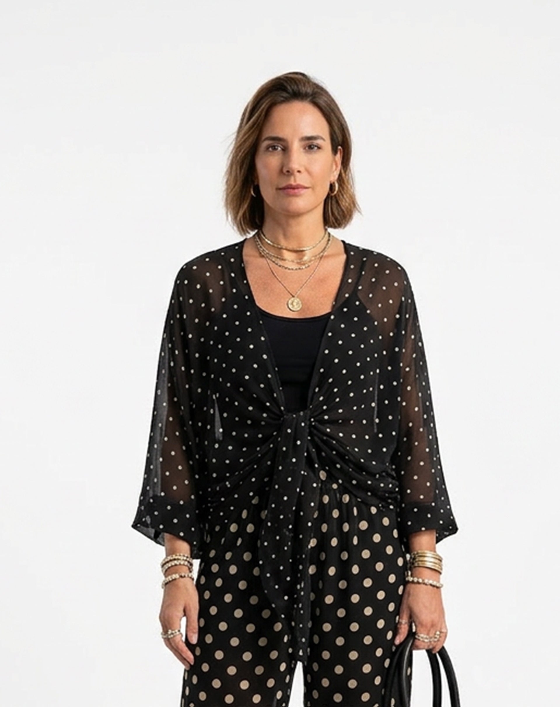 Explore a leveza e sofisticação do Kimono Amplo em Chiffon com Amarração Frontal. Sua modelagem fluida proporciona movimento elegante, enquanto a leve transparência do tecido traz um toque delicado e contemporâneo ao visual.