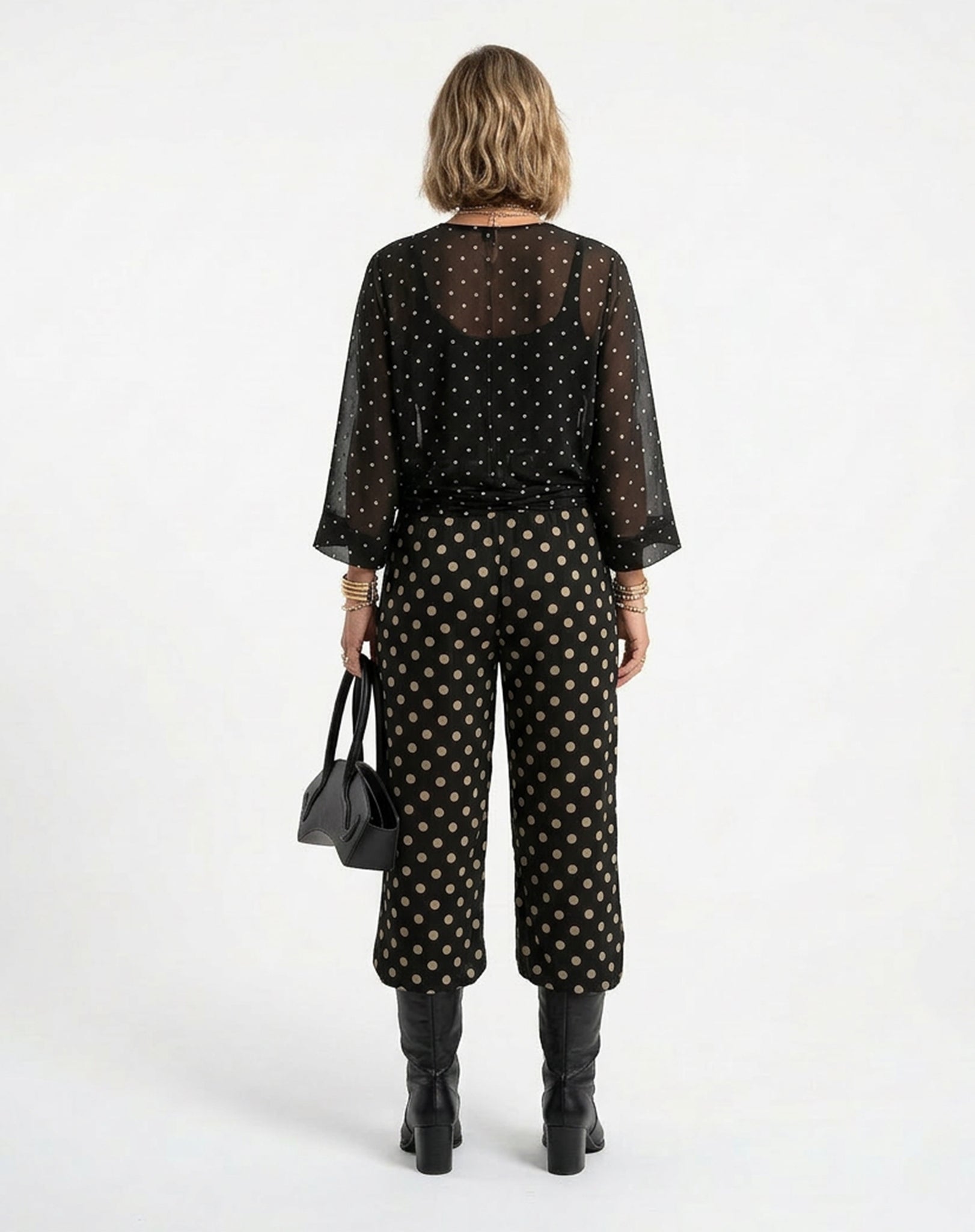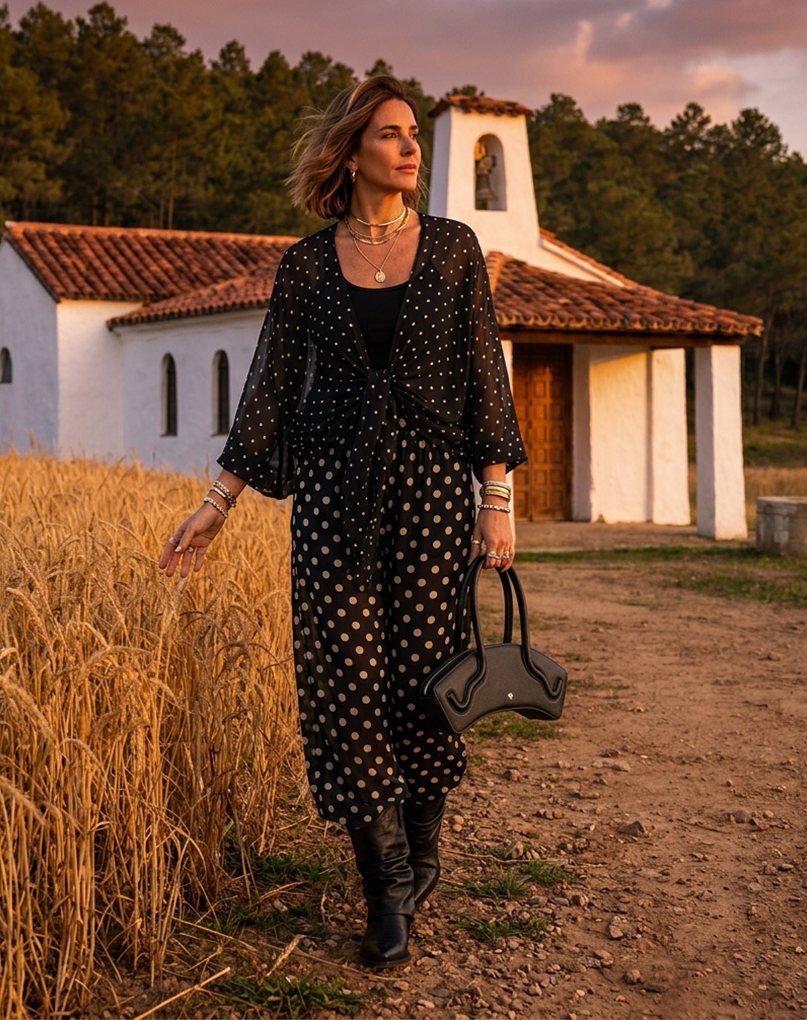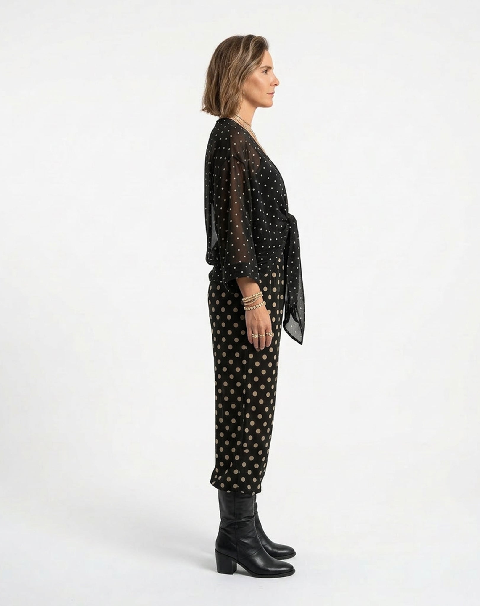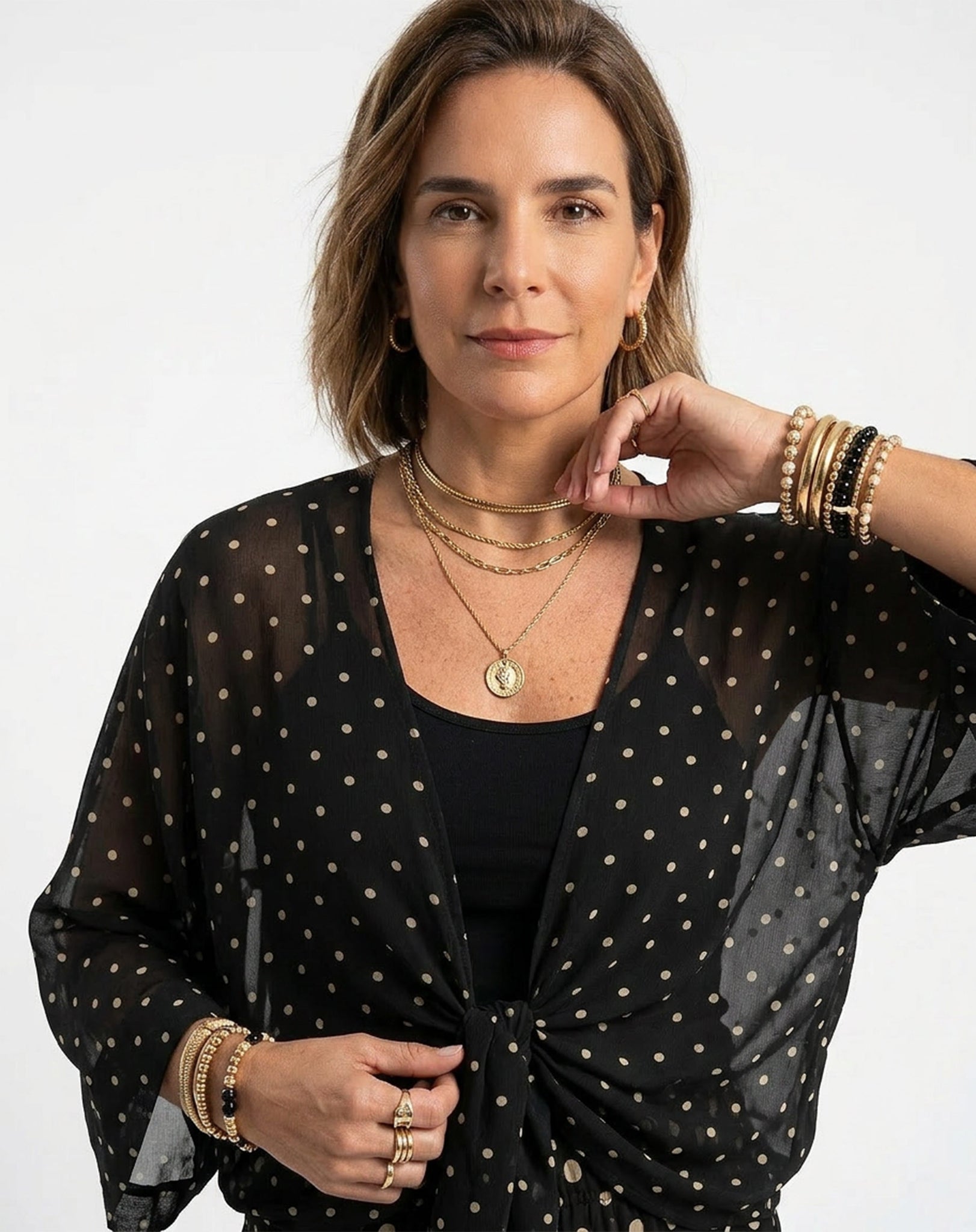 A amarração frontal valoriza a silhueta e permite diferentes formas de uso — mais ajustado ao corpo ou solto para um caimento despojado e sofisticado. Versátil, é ideal para compor produções que transitam do dia a dia a ocasiões especiais com charme e leveza.