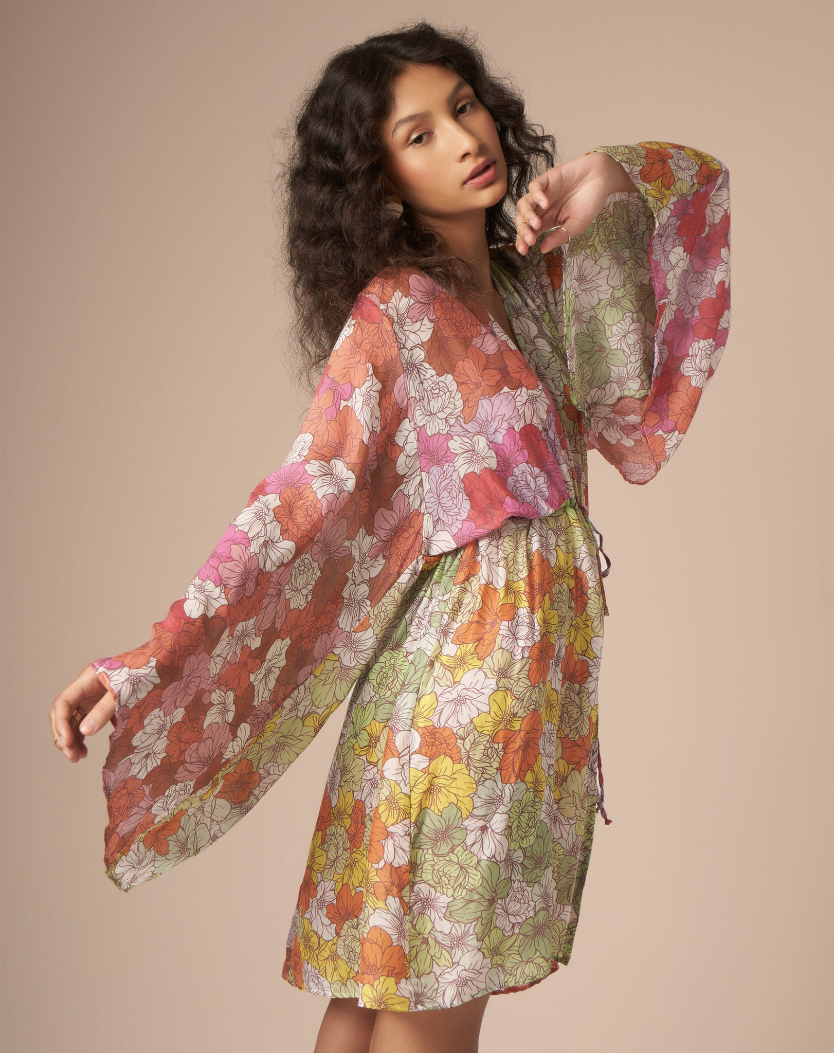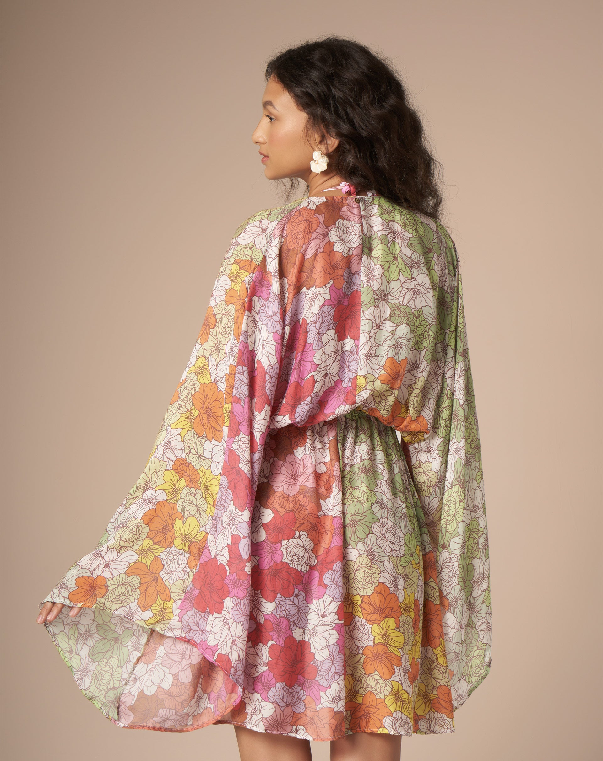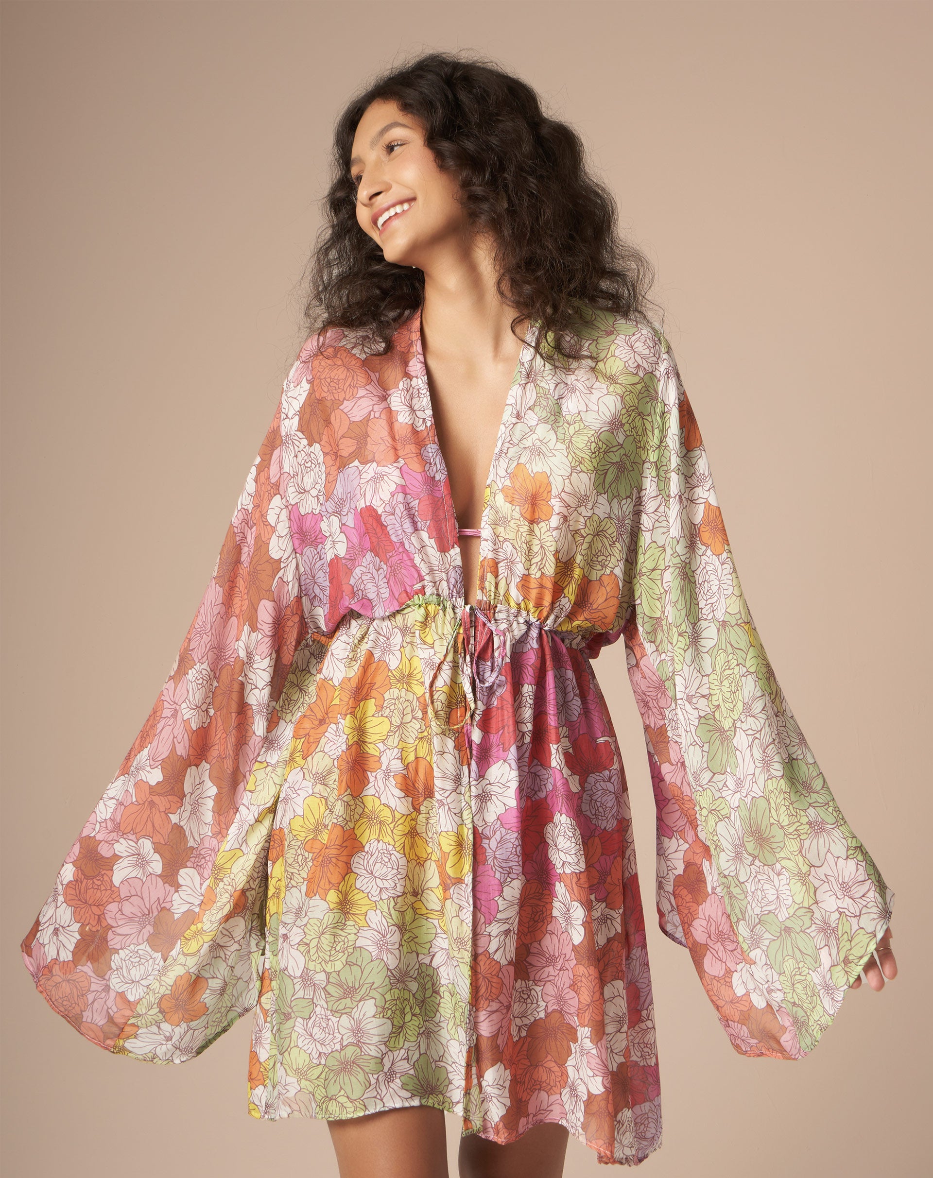A estampa floral colorida é exclusiva. Em seda com modal, sua transparência por cima dos biquínis fica um charme e a paleta de cores remete às quatro estações. A modelagem de mangas amplas veste todo o tipo de corpo e deixa um movimento lindo.