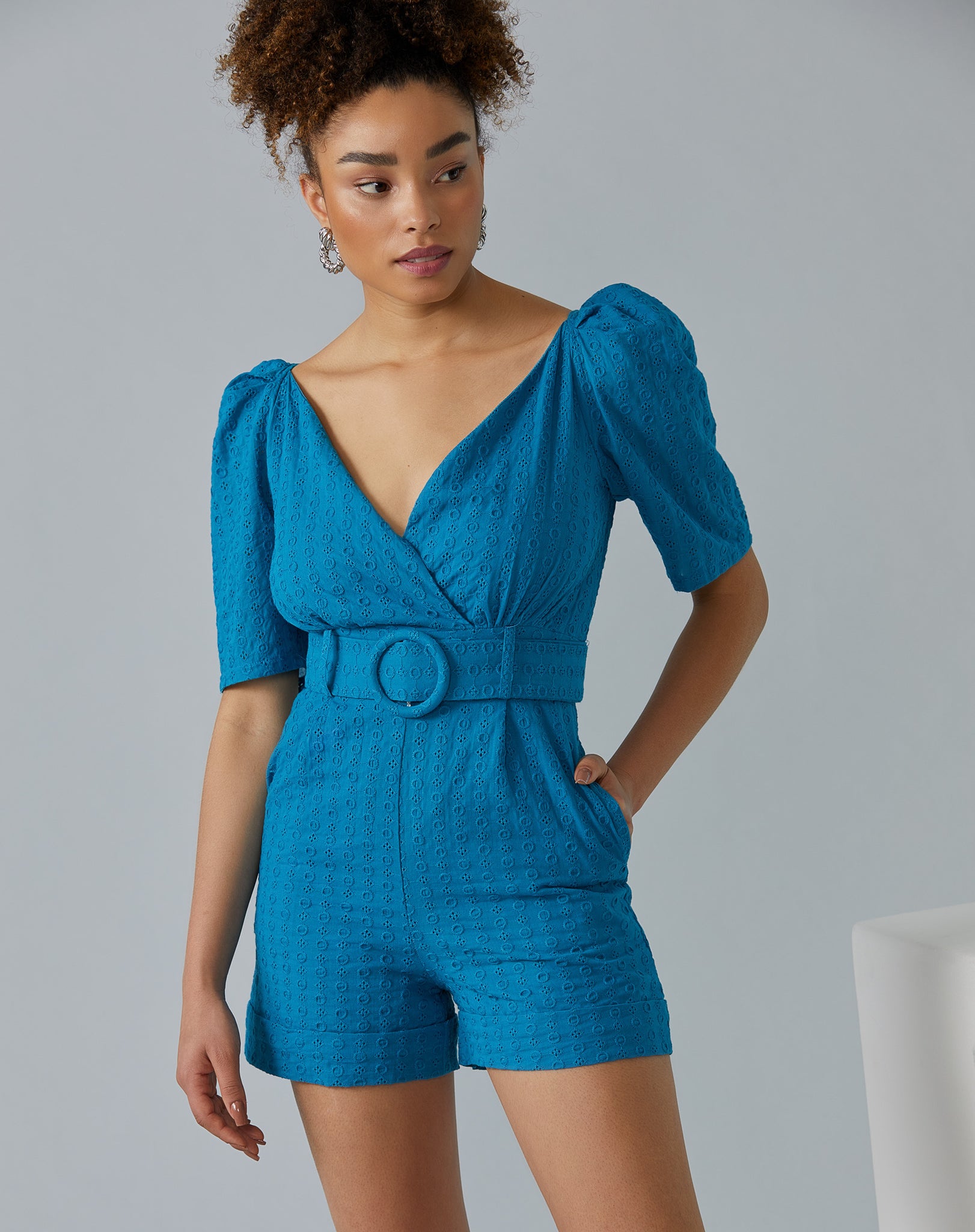 Macaquinho de laise com manga curta bufante e cinto, perfeito para um look casual elegante. O design acinturado e o decote transpassado garantem um visual sofisticado e moderno.
