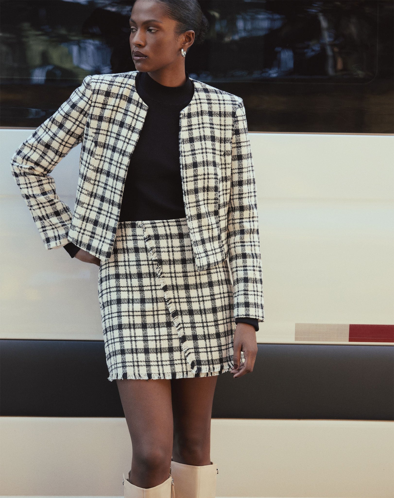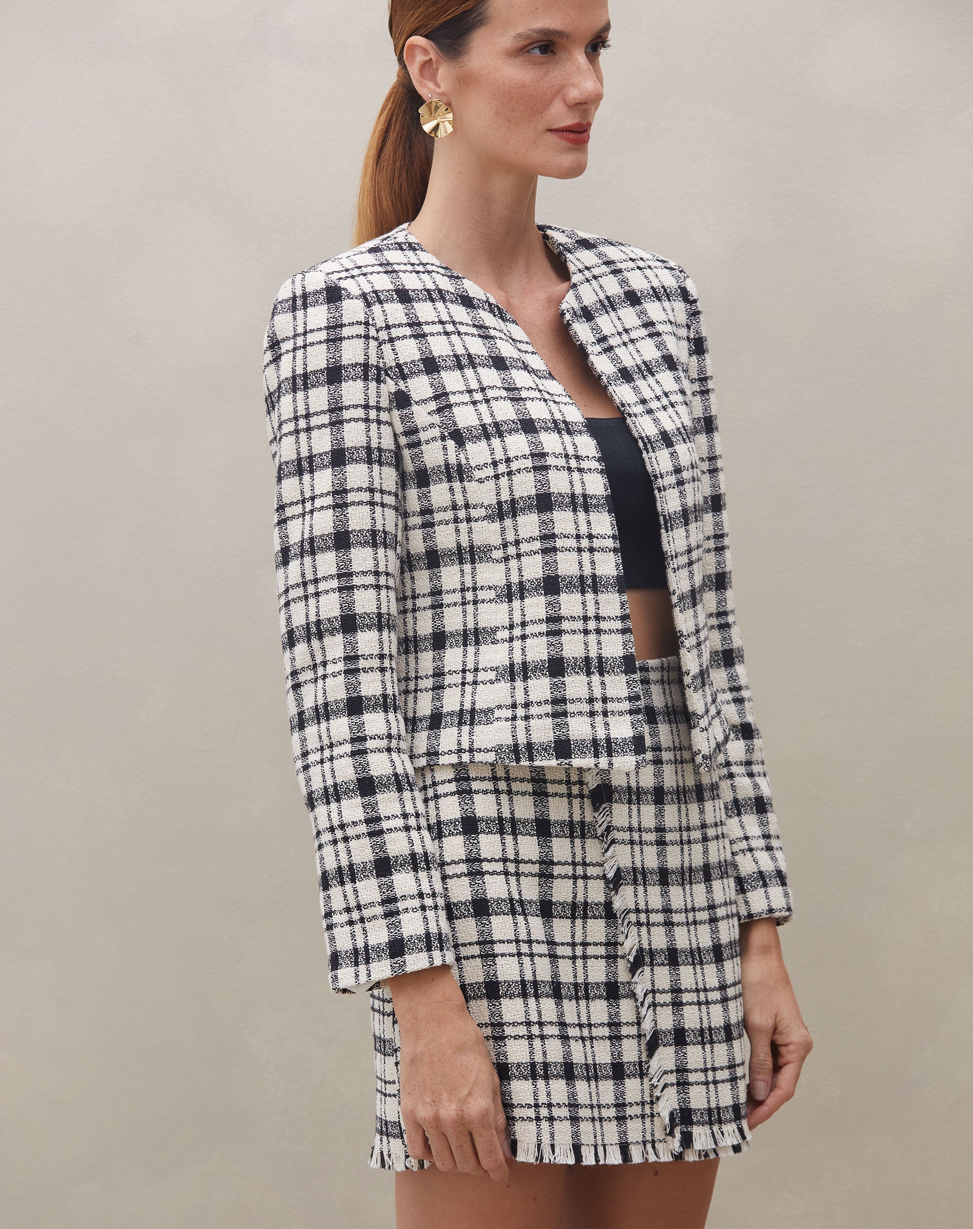Mini saia de alfaiataria em tweed xadrez, perfeita para um look elegante e descolado. Ideal para ocasiões casuais ou noturnas, essa peça clássica e atemporal é um must-have no closet de quem busca estilo e sofisticação.