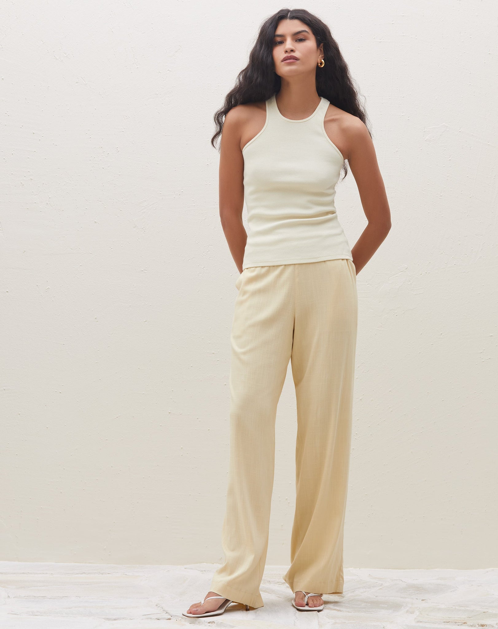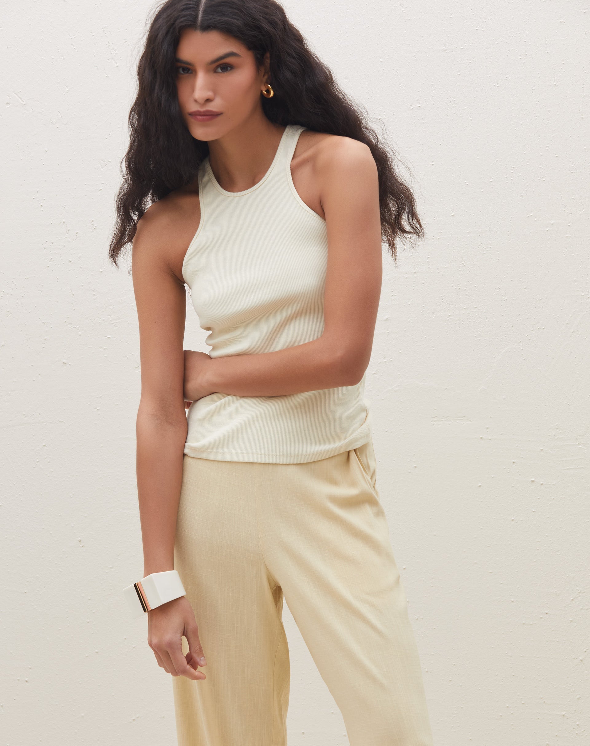 Regata decote halter de malha ribana, perfeita para um look casual chic. O design minimalista e a silhueta justa garantem um visual elegante e versátil.