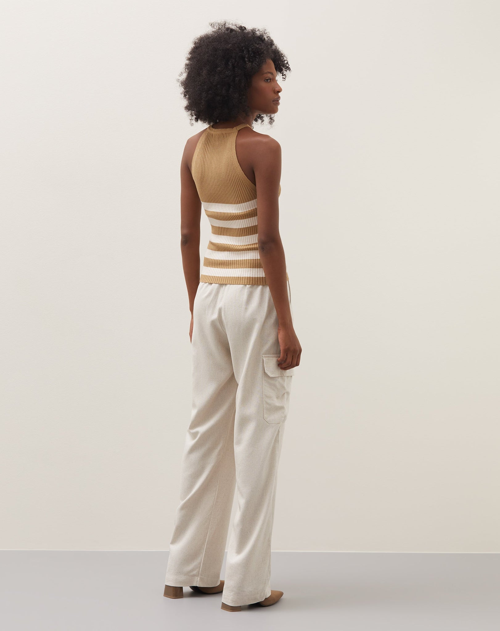 Desfrute do verão com estilo e conforto com nossa Regata Halter Neck de Tricot. O design listrado e o decote nadador dão um toque moderno e descolado à peça, perfeita para um passeio descontraído ou um almoço com as amigas.