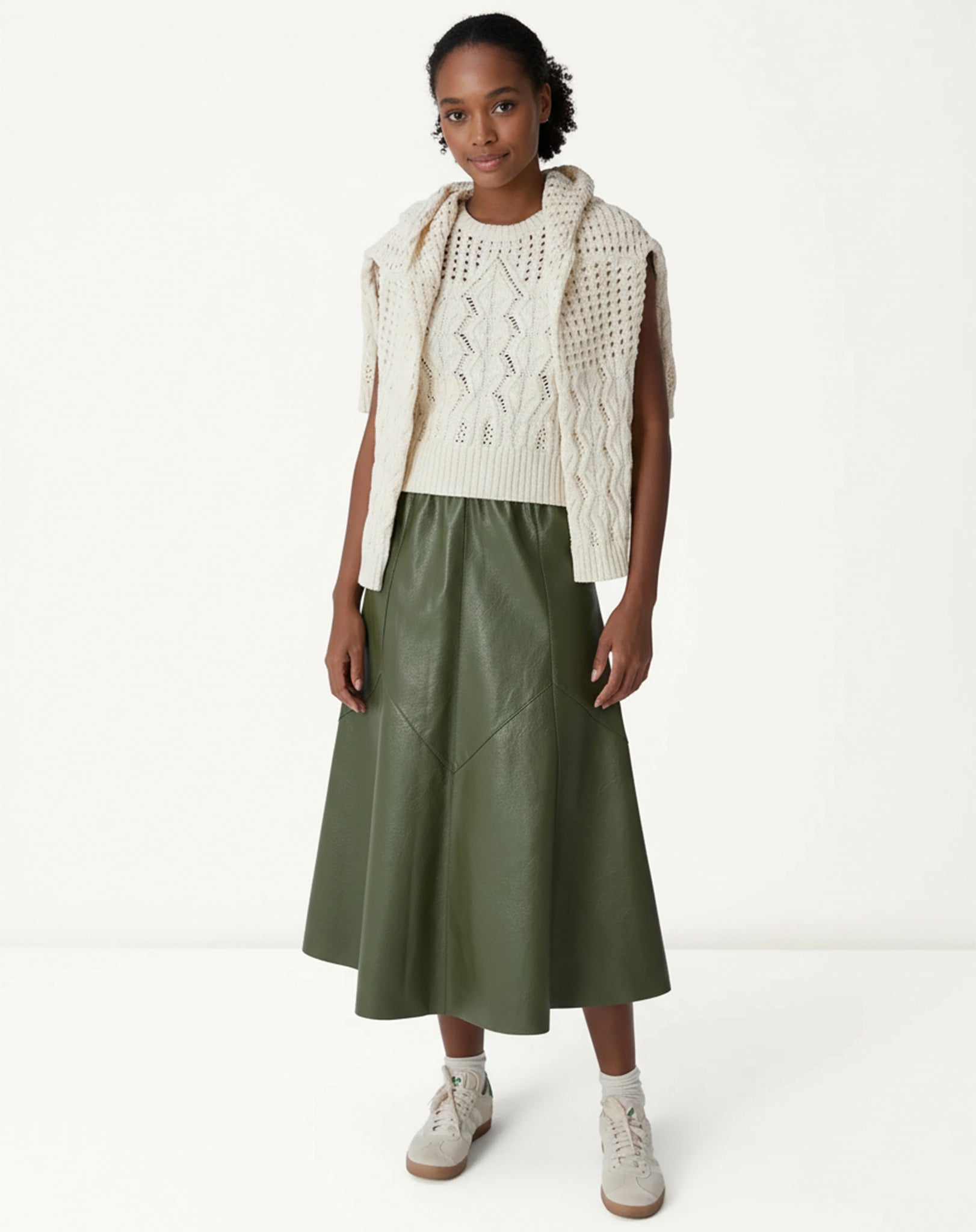 Desperte olhares com a saia midi statement! Com recortes assimétricos e cintura alta, essa peça em poliuretano é o item ideal para um look elevado e descolado. Perfeita para eventos sofisticados ou um jantar especial.