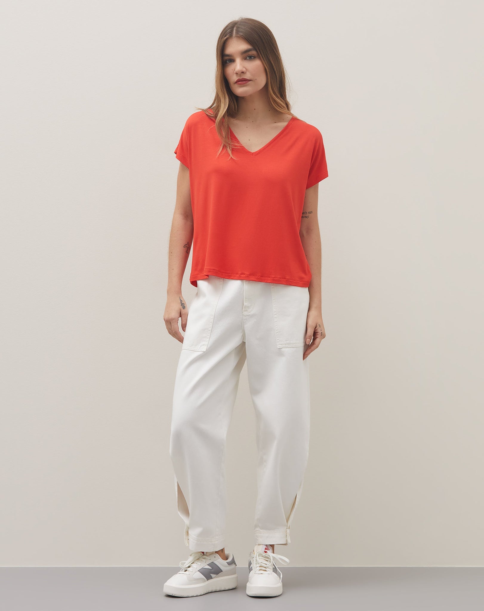A t-shirt de viscose com decote V é a peça curinga que faltava no seu closet de luxo. Feita em malha de alta qualidade, seu design minimalista e elegante se destaca pela versatilidade e conforto. Perfeita para um look elevado em qualquer ocasião.