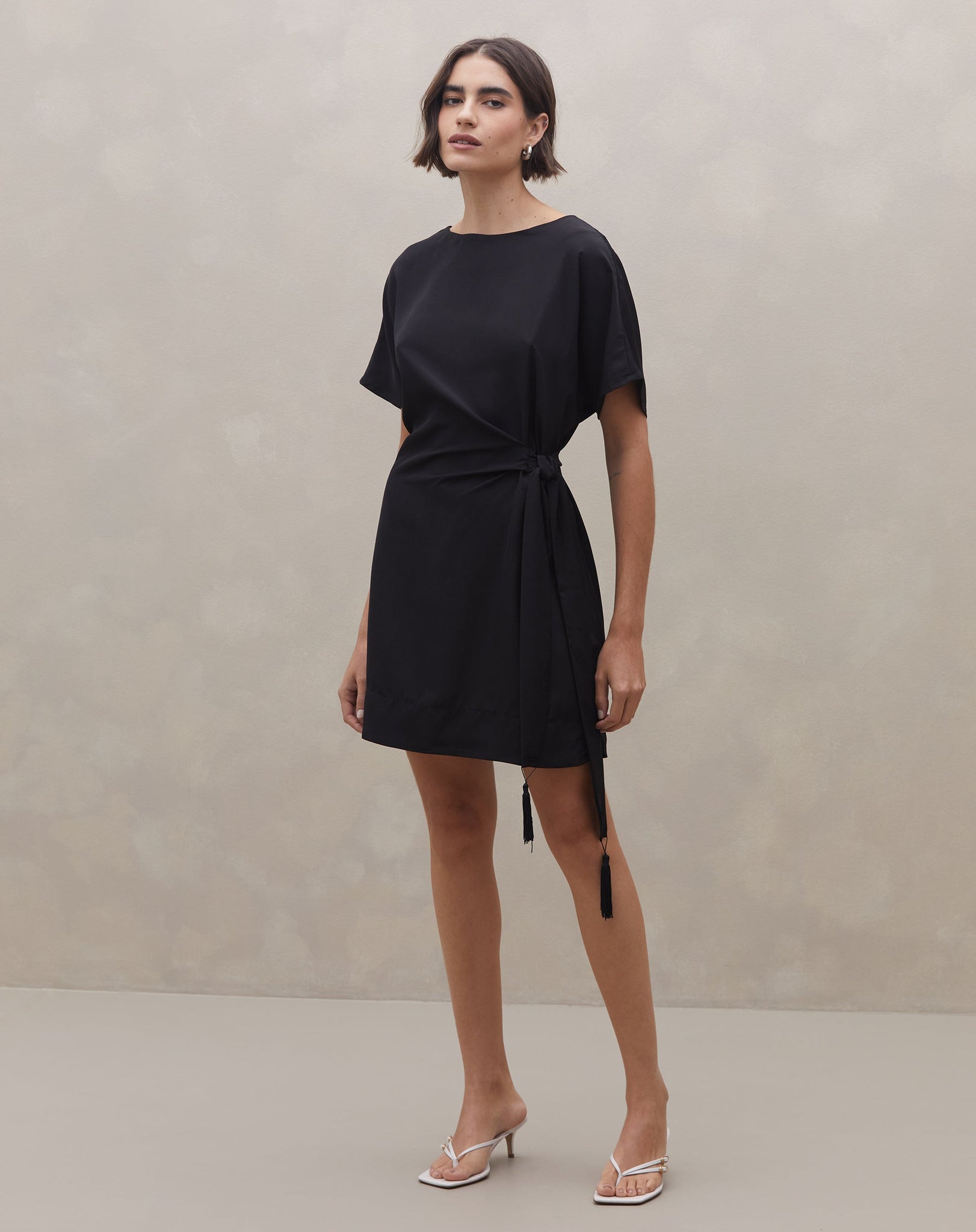Vestido curto com amarração lateral e detalhe de tassel, perfeito para um look casual elegante. Seu design clássico e acinturado garante versatilidade em diversas ocasiões.